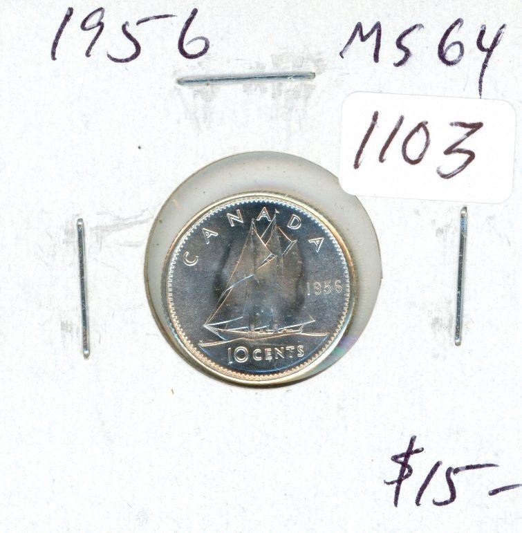 1956 Canadian Silver 10 cents. MS-64. Bright White. Nice.