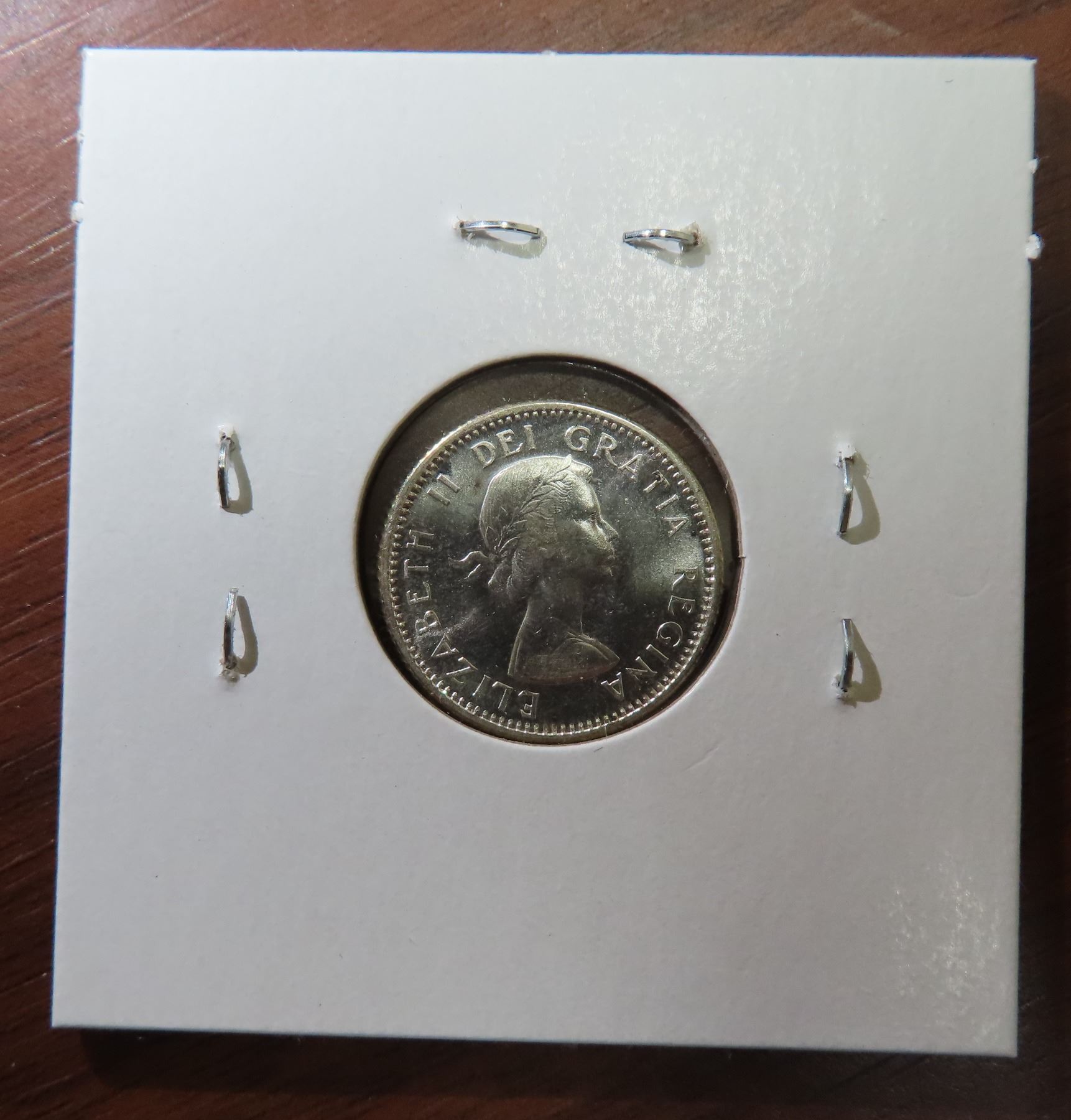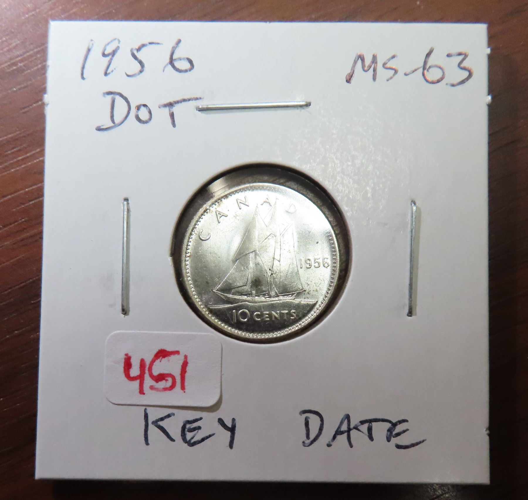 1956 Dot Canadian Silver 10 Cents. Scarce Dot variety. MS-63 with carbon spots.