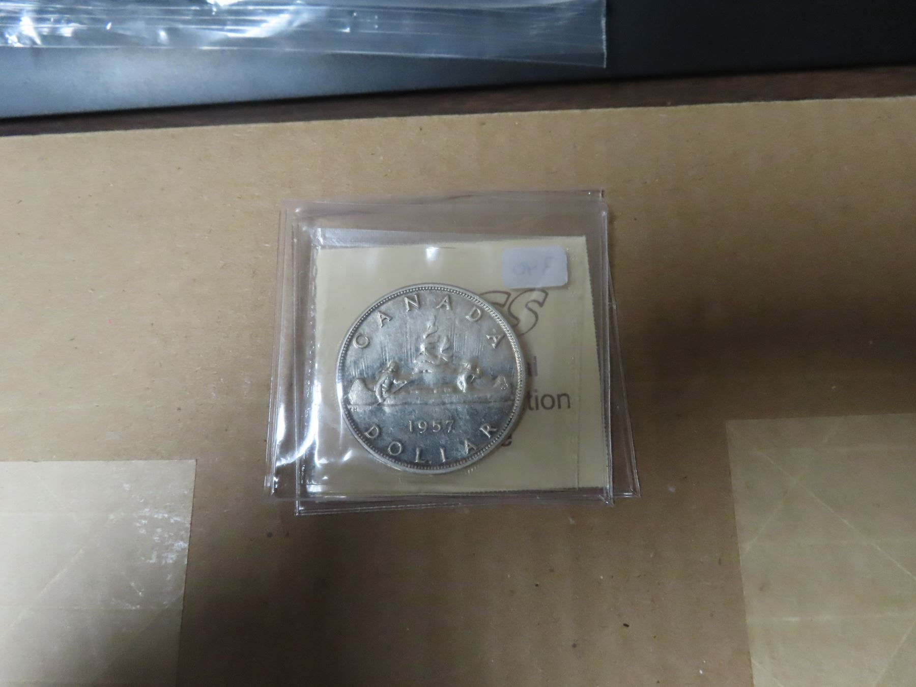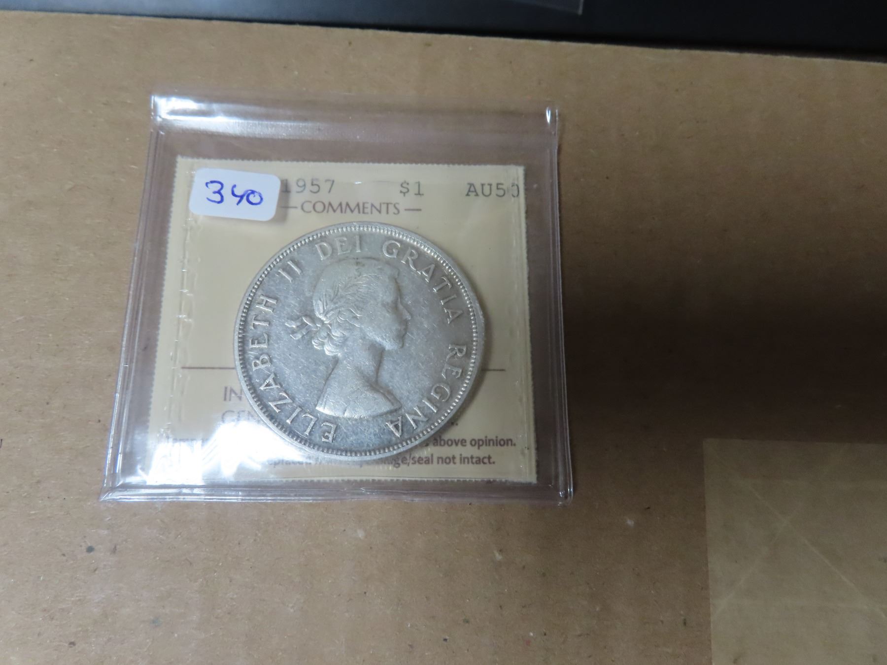 1957 Canada Silver Dollar, One Waterline, AU 50 (ICCS XFO 751)