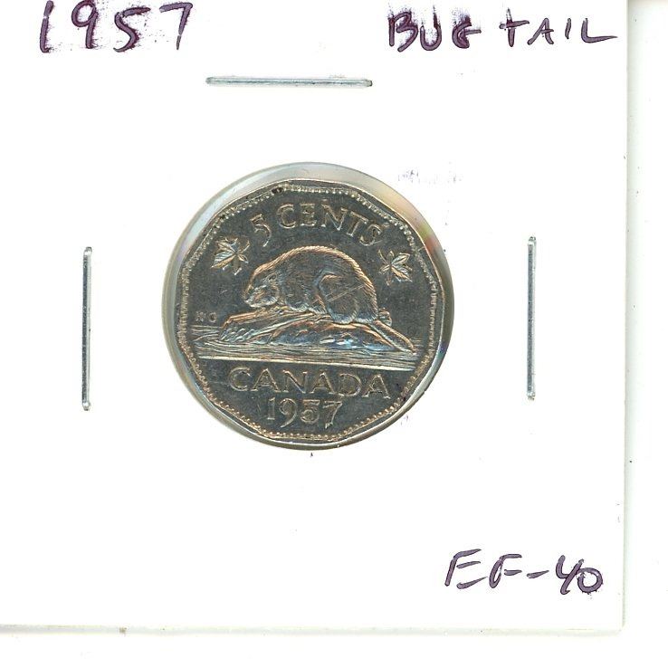 1957 Canadian Bug Tail Nickel 5 Cents