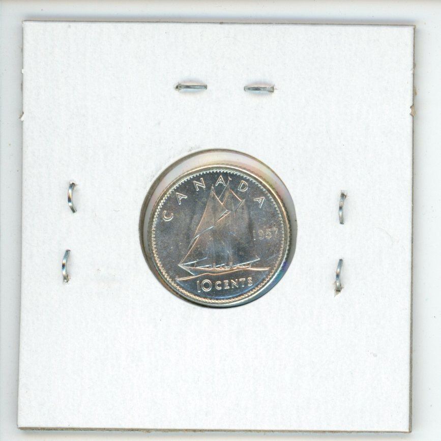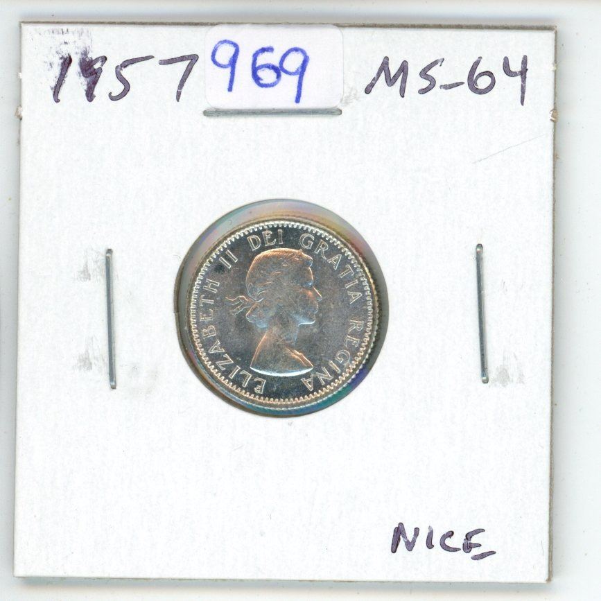 1957 Canadian Silver 10 Cents. MS-64. Nice.