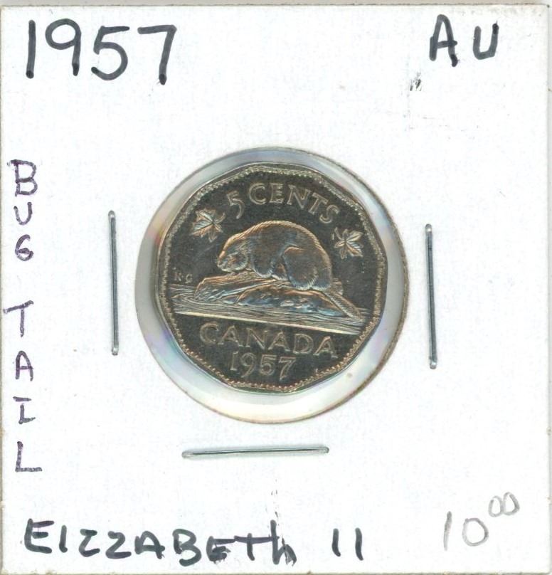 1957 Elizabeth II Five Cent Coin (AU) (Bug Tail)
