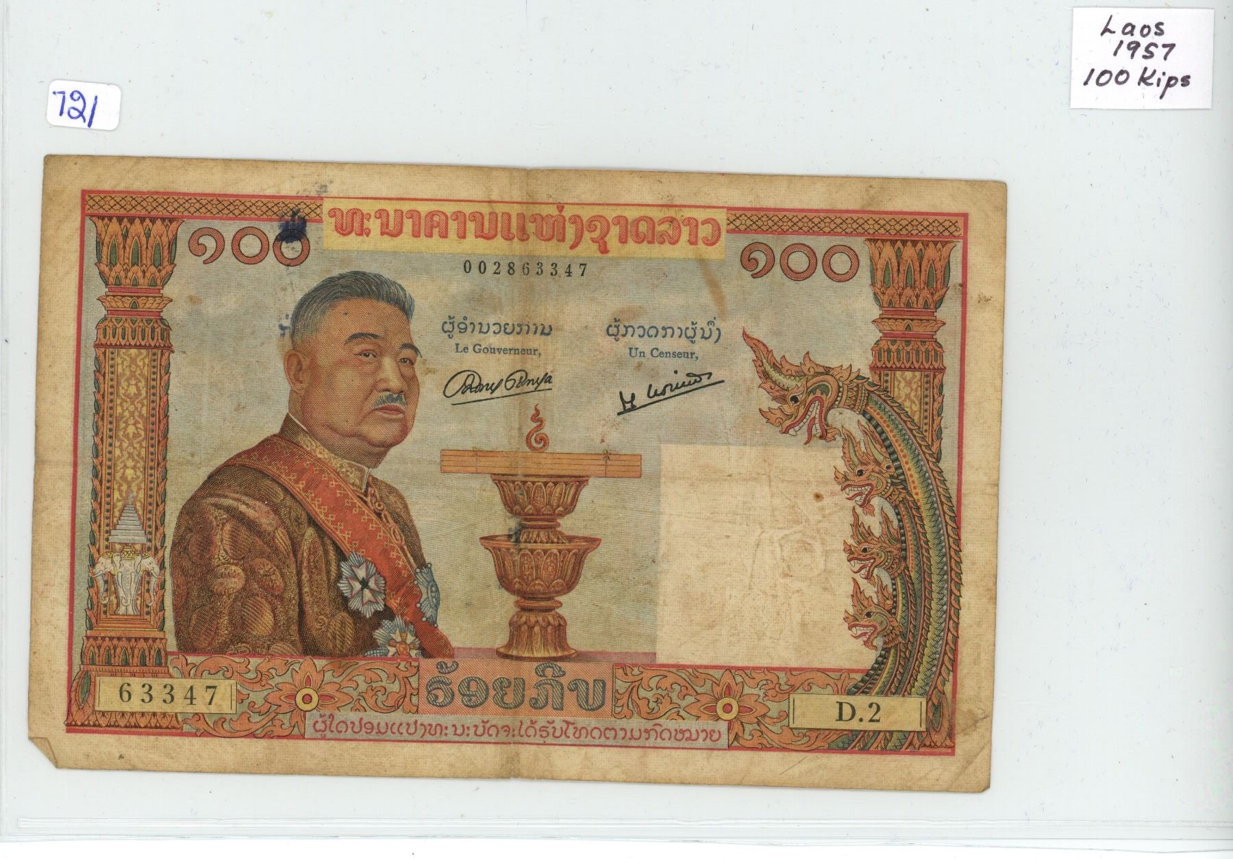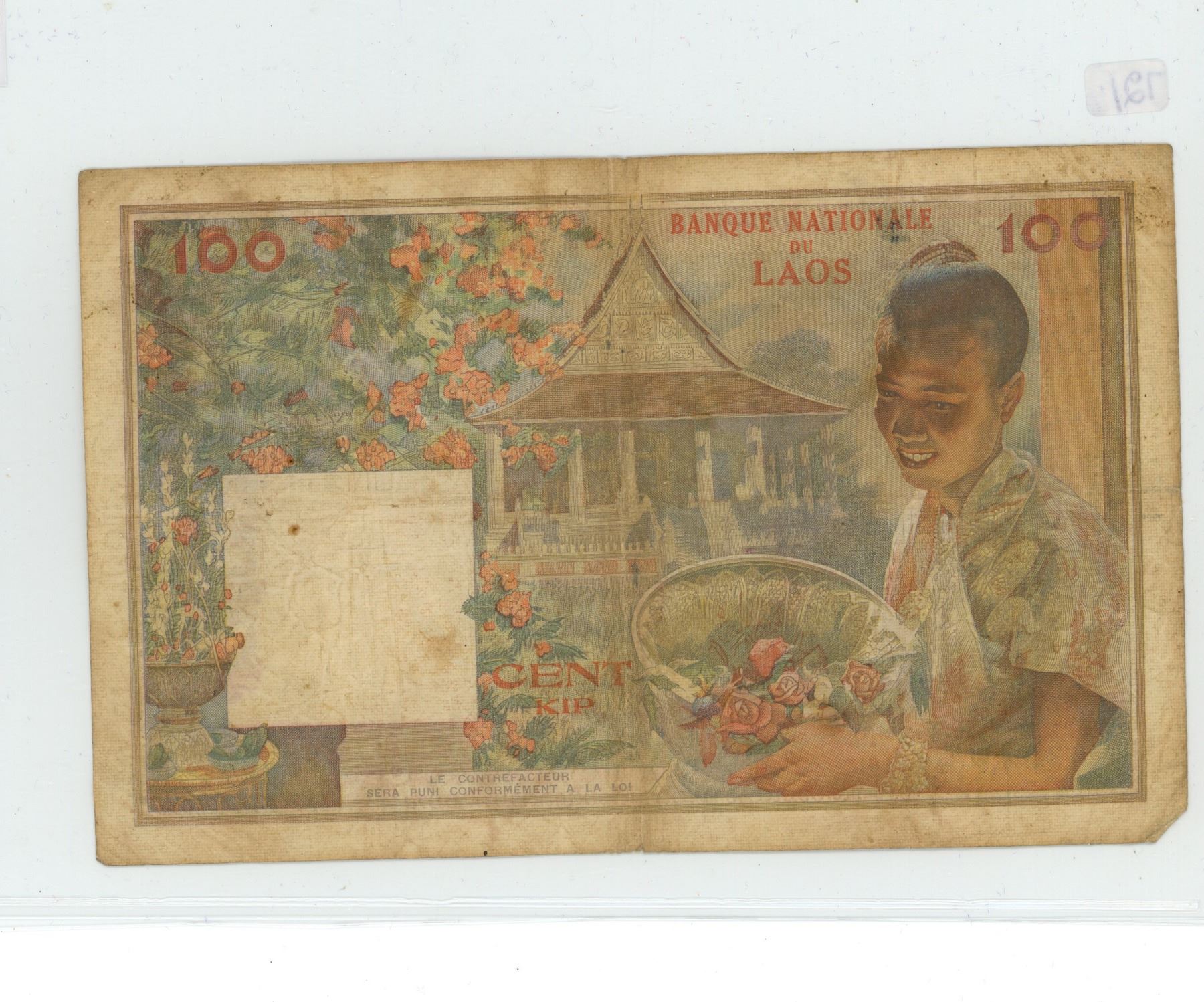 1957 Laos 100 Kip banknote