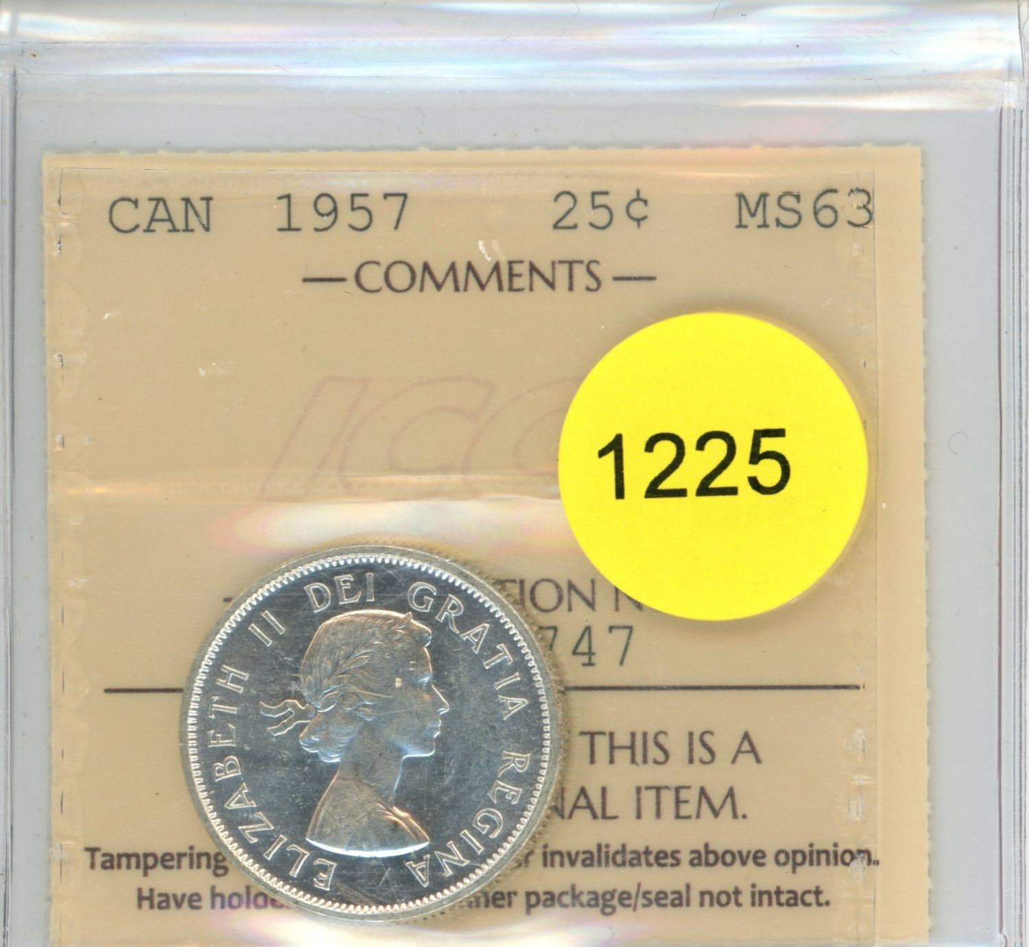 1957 MS63 ICCS Graded Canadian Twenty-Five Cent Coin