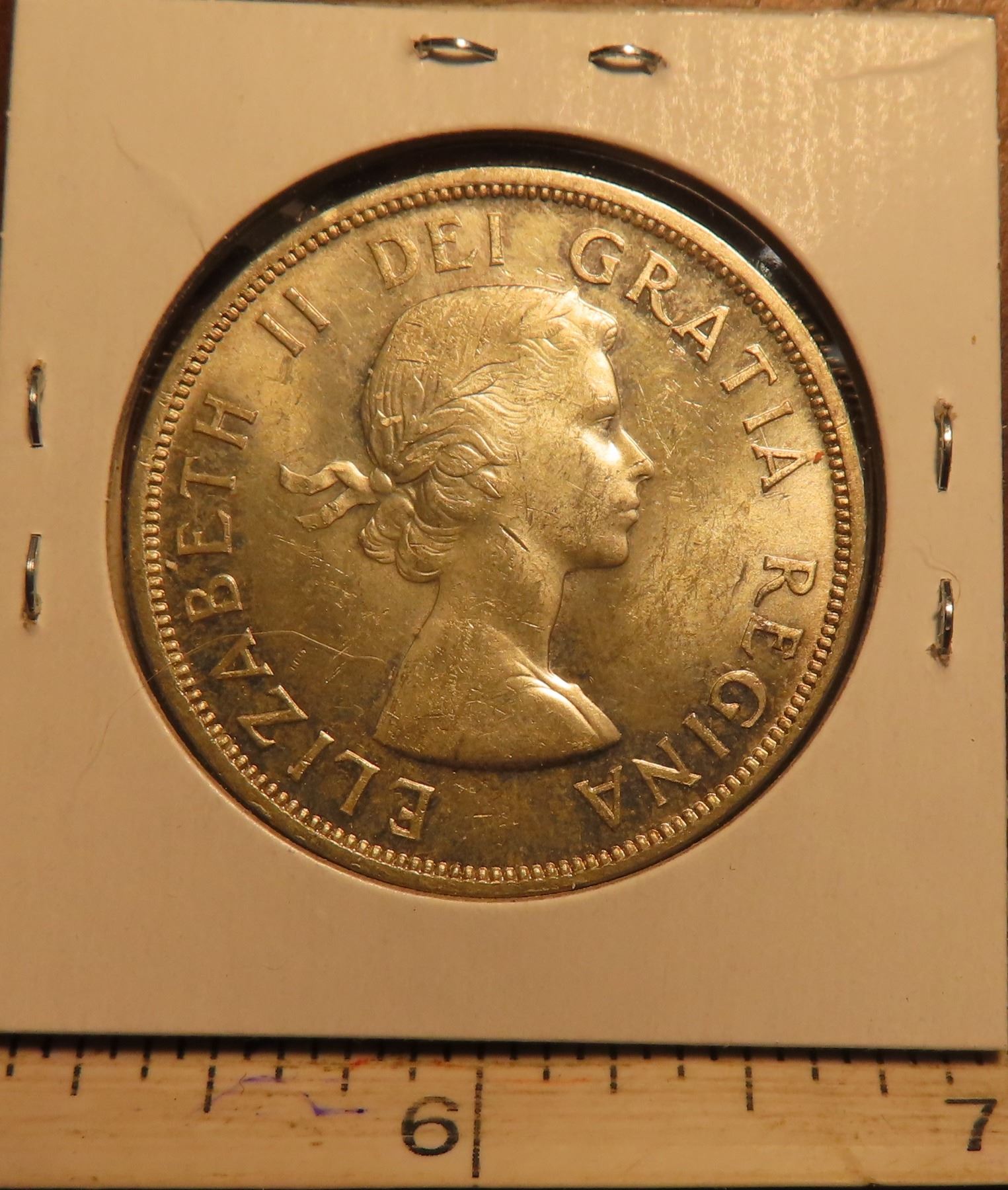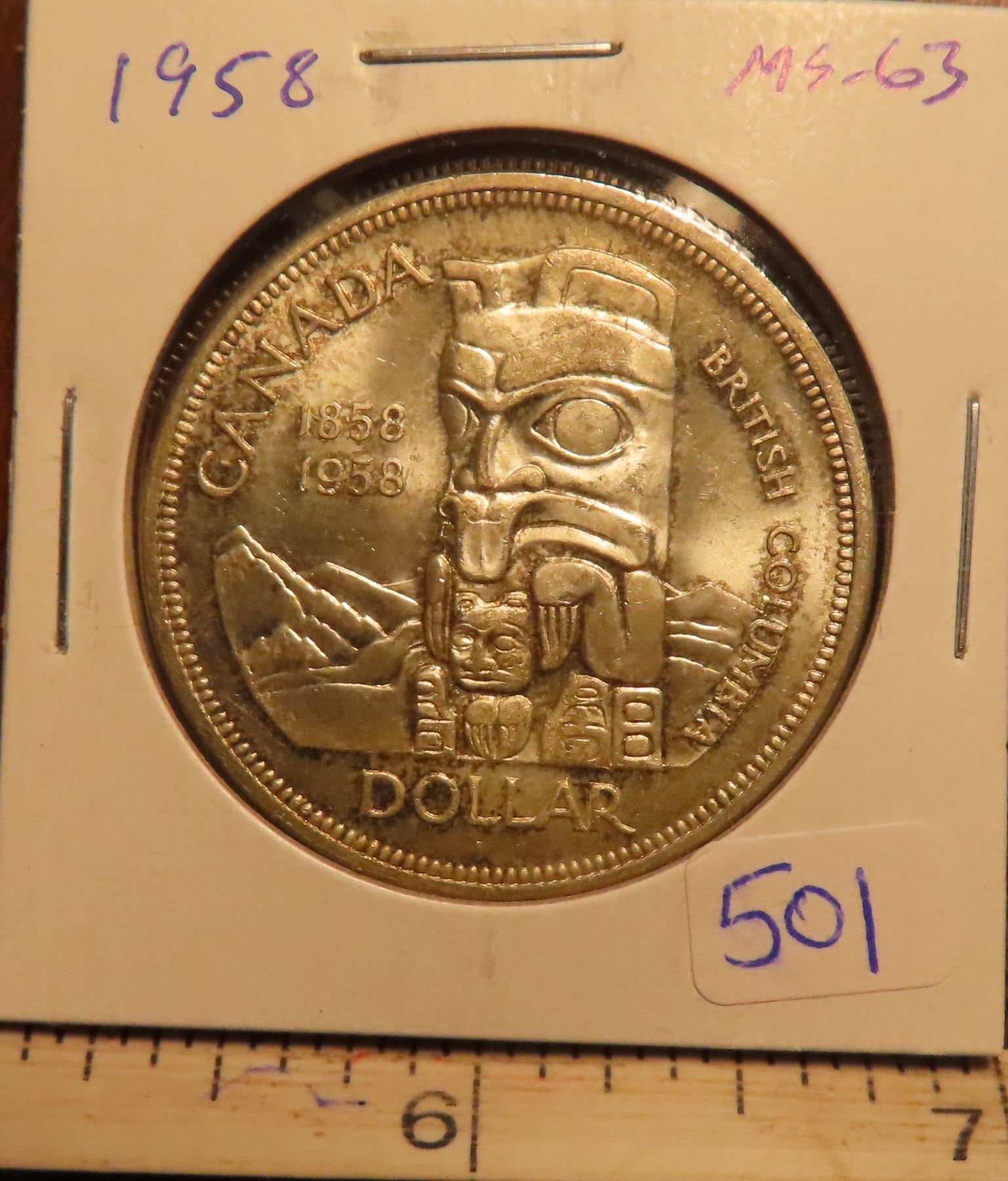 1958 Canadian Silver Dollar. Totem Pole. Commemorates the Gold Rush and the establishment of British Columbia as a crown colony. MS-63. Lustrous.