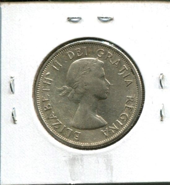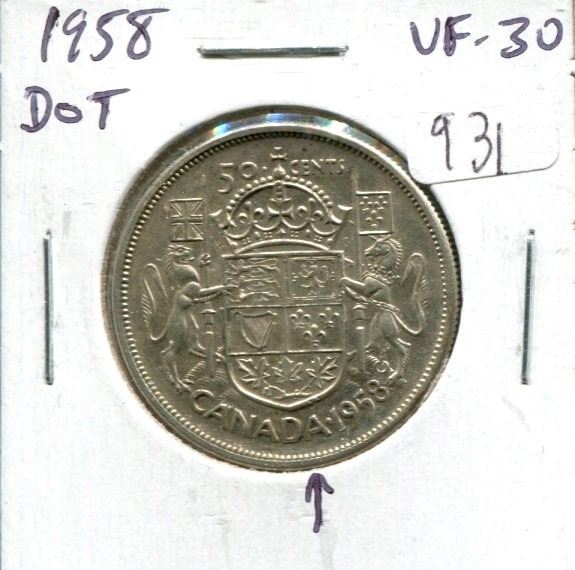 1958 Dot Canadian Silver 50 Cents. Scarce. VF-30.