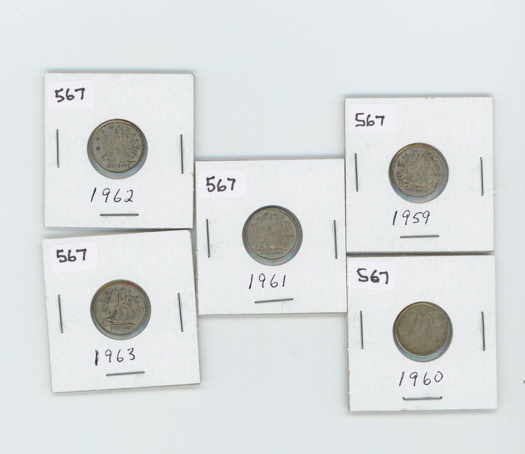 1959,1960,1961,1962,1963- CANADIAN SILVER 10 CENT