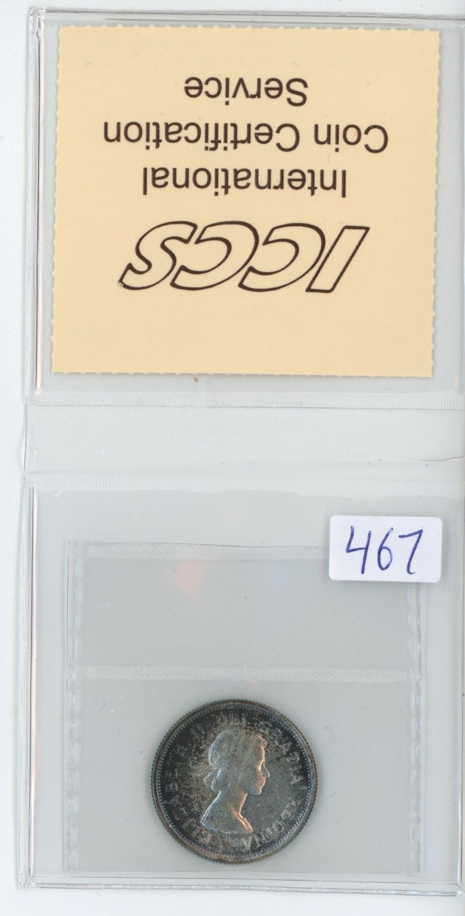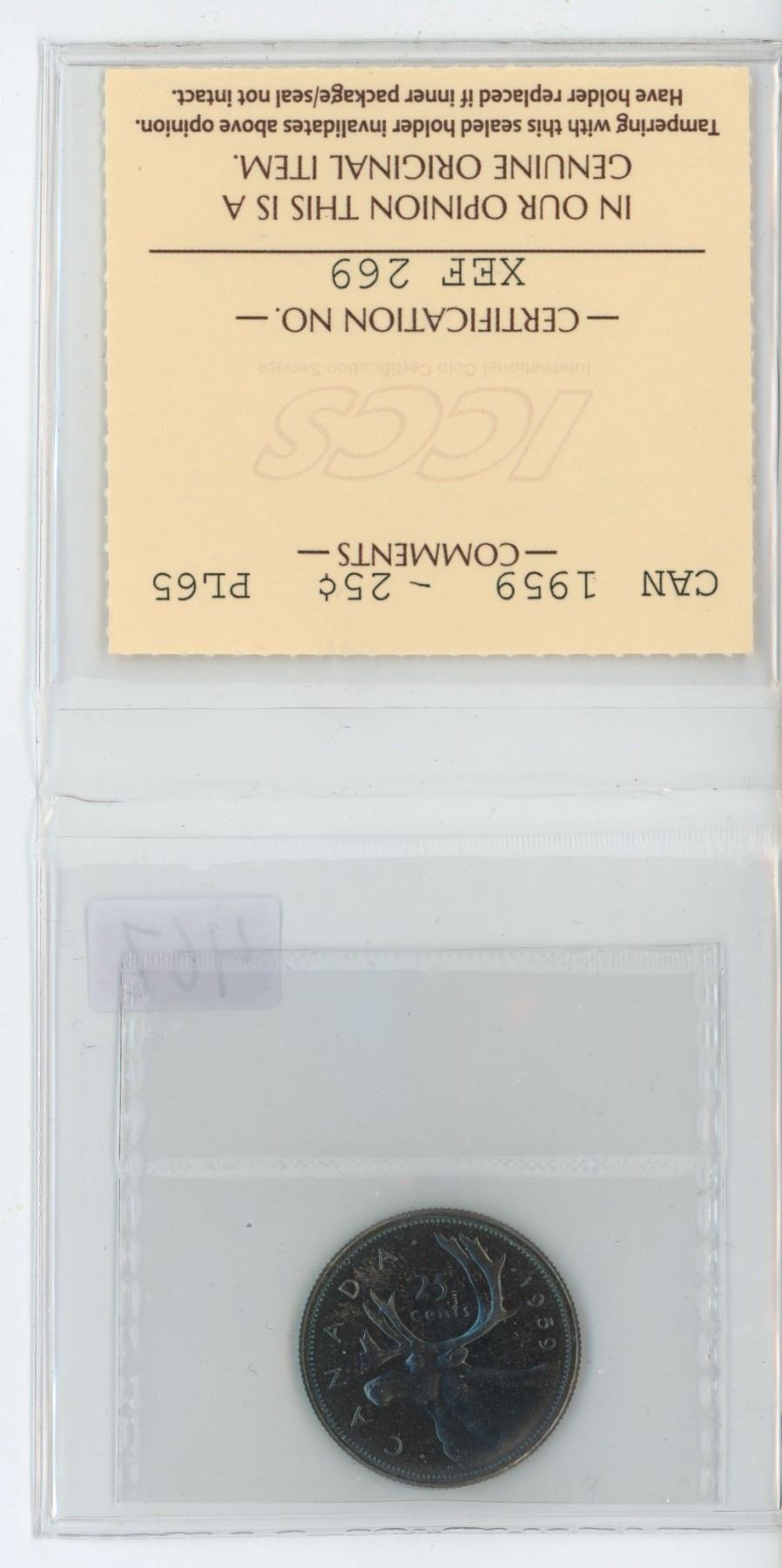 1959 Canadian Silver 25 Cents. ICCS certified and graded PL-65. Nicely Toned, especially the Reverse.