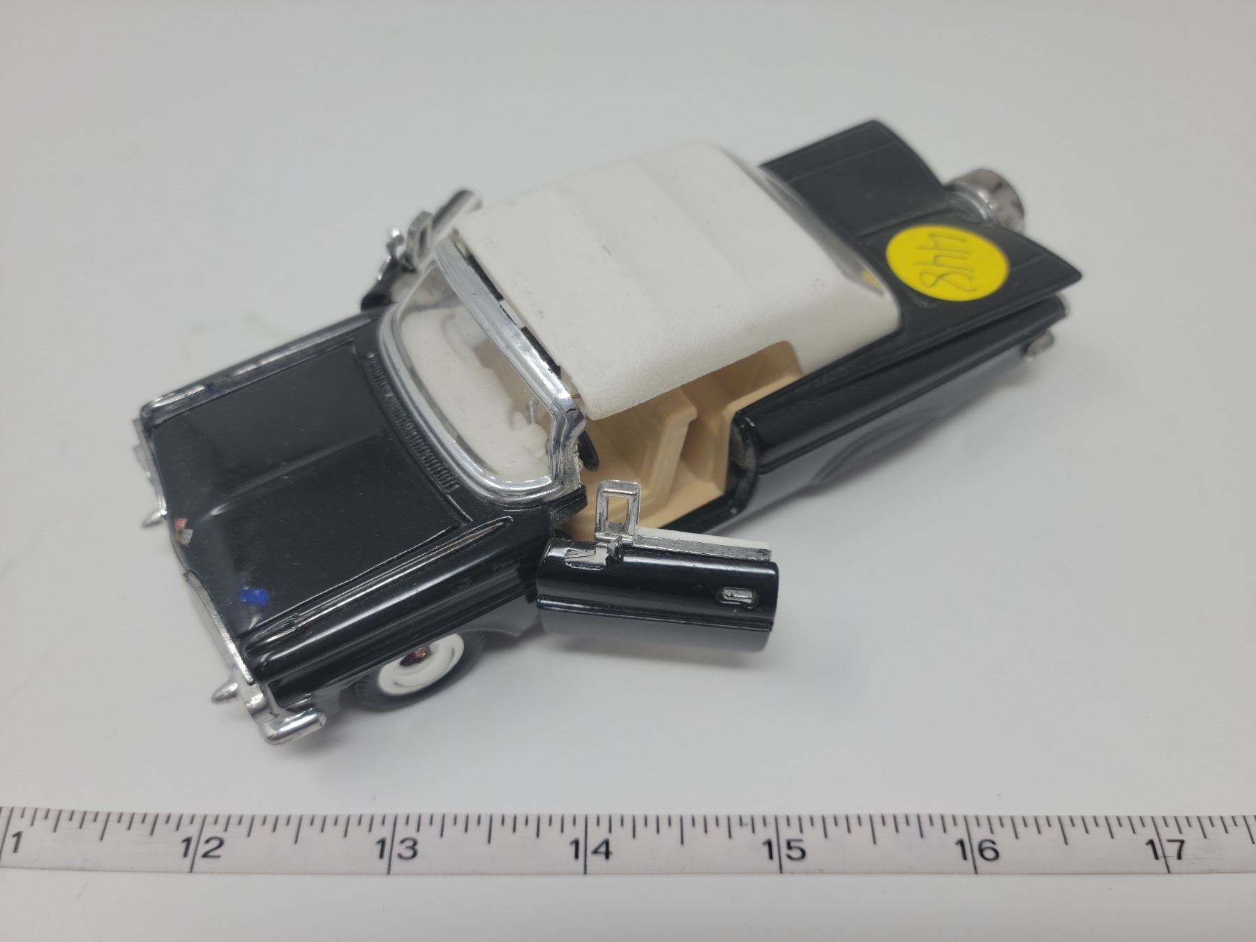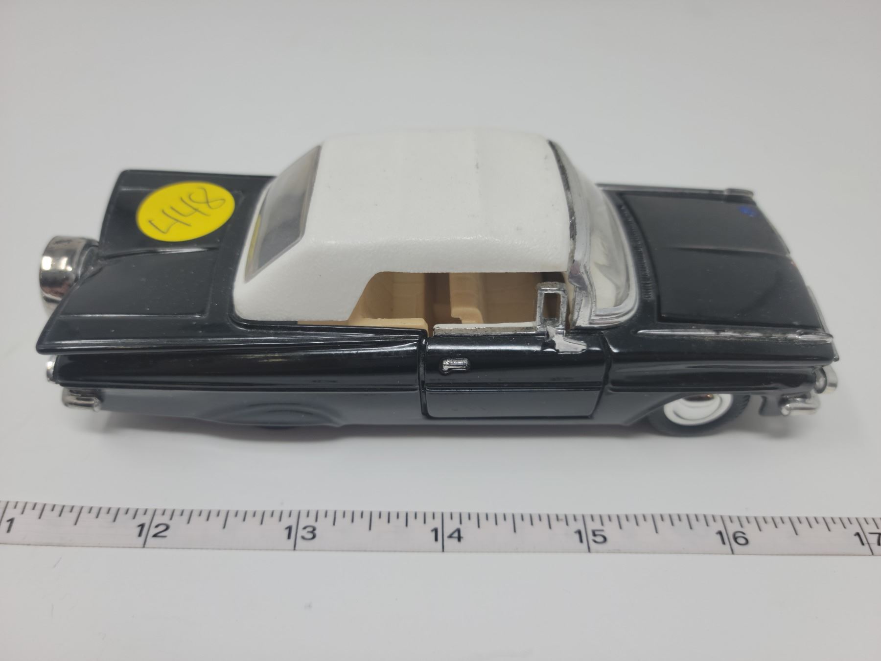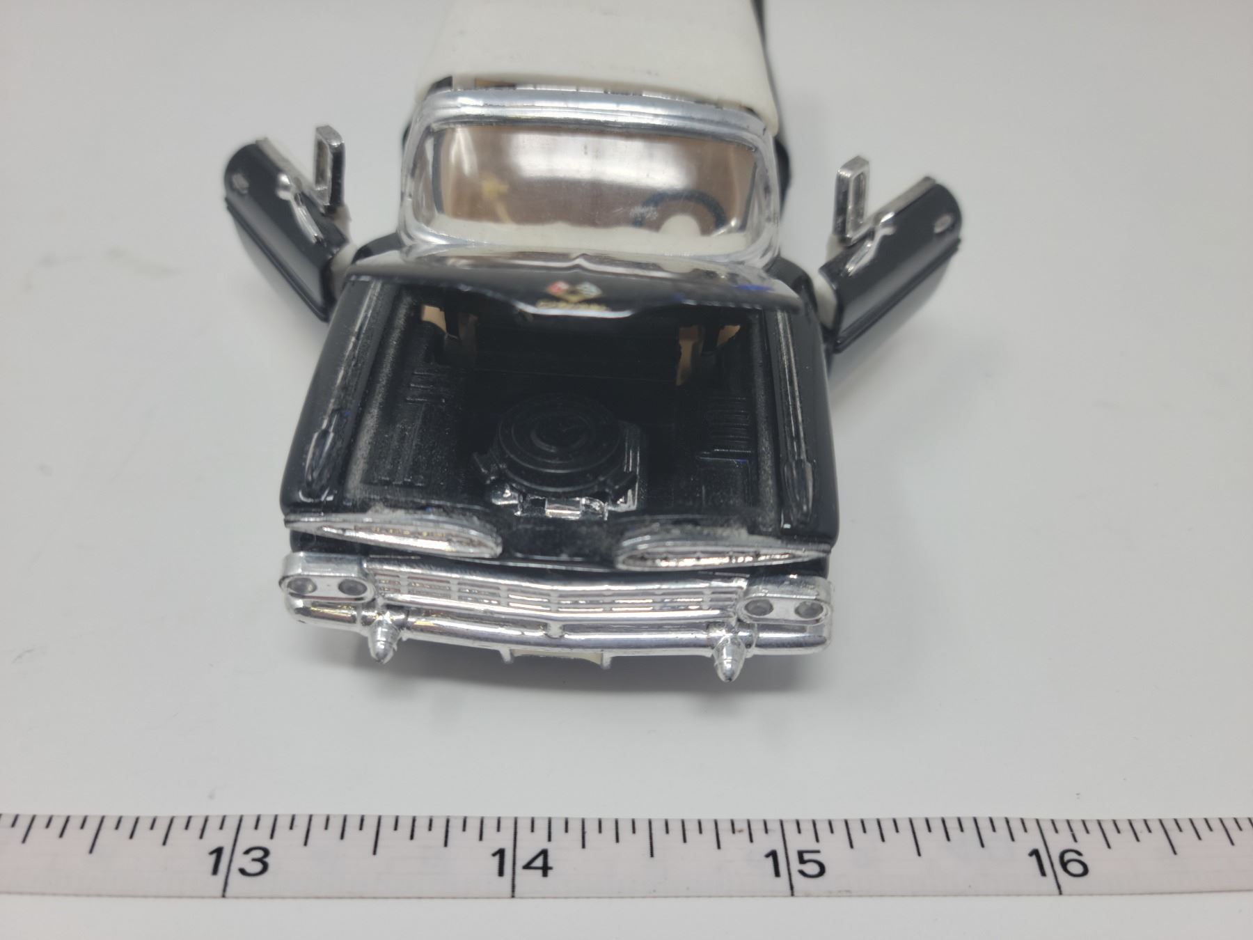 1959 Chevrolet Impala scale model. 6" long, doors & hood open. Pull back and car drives forward.