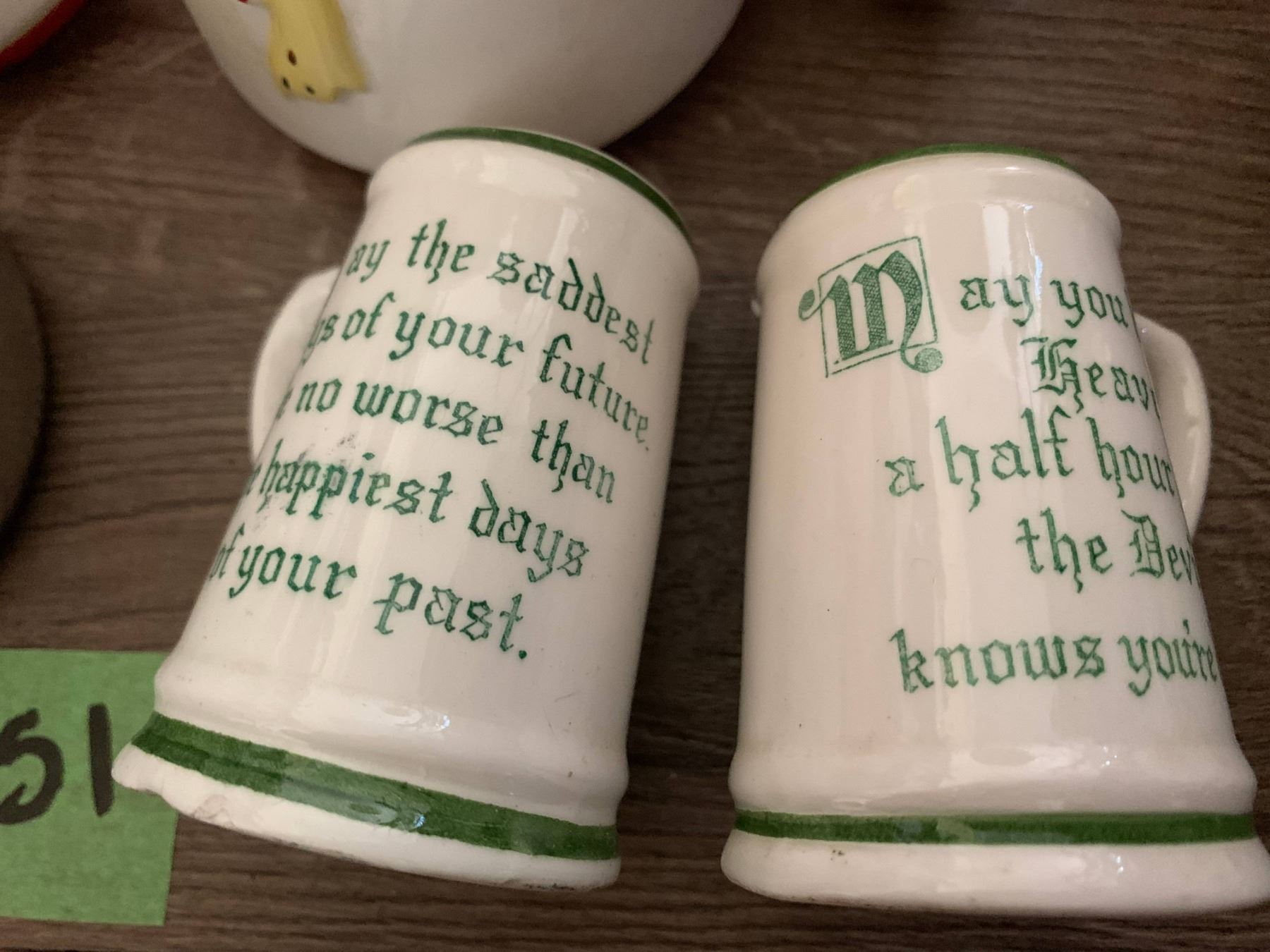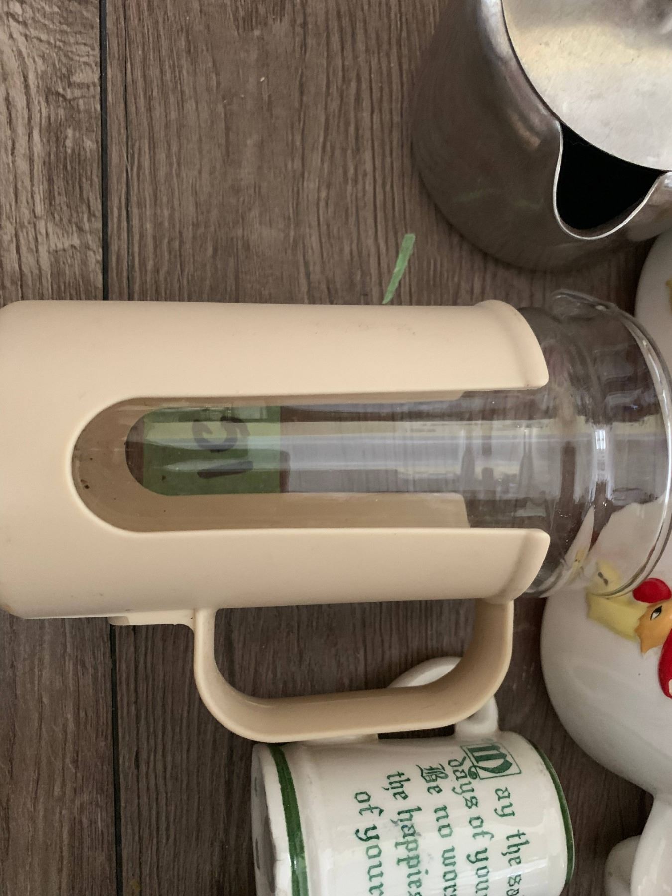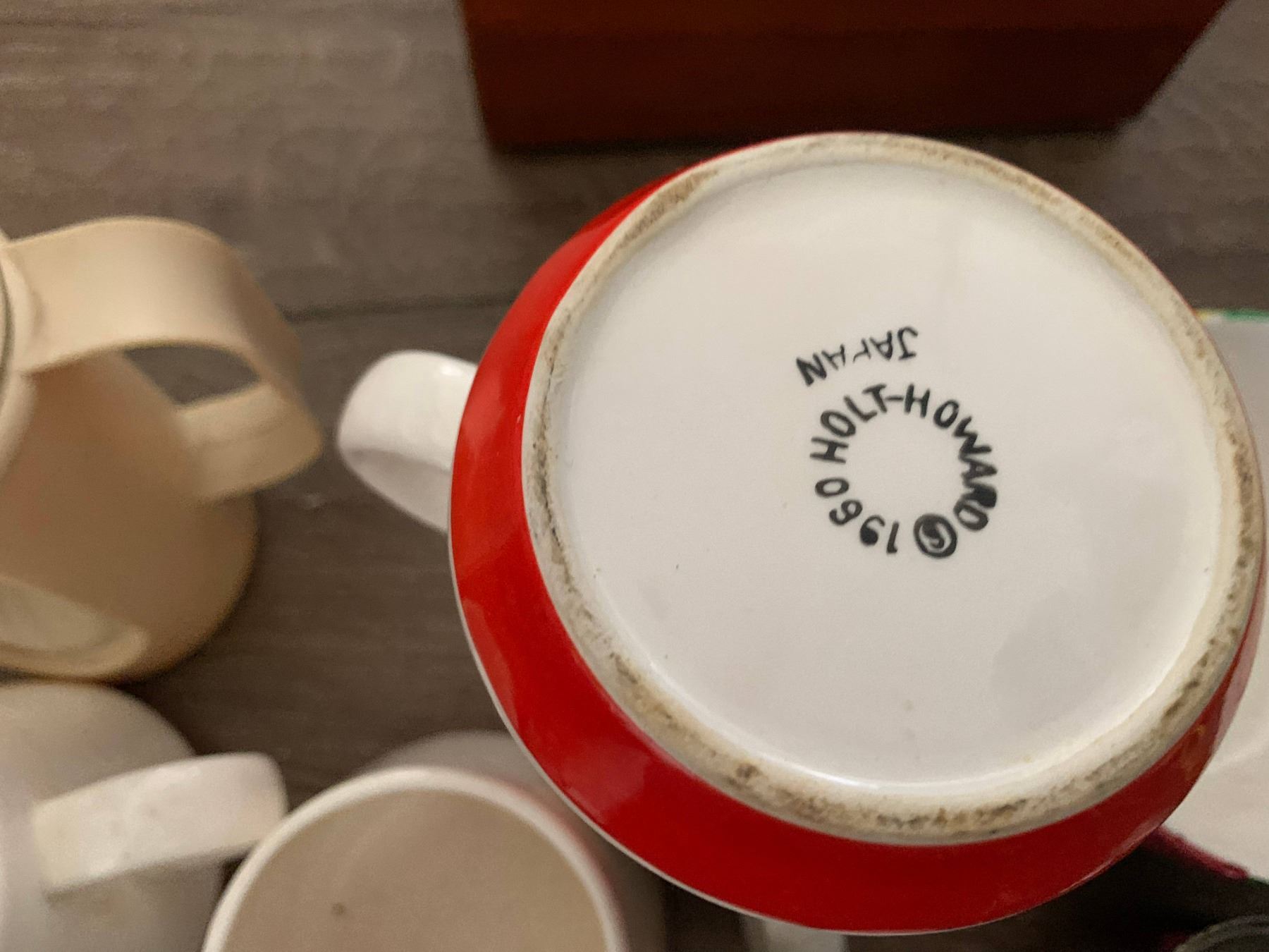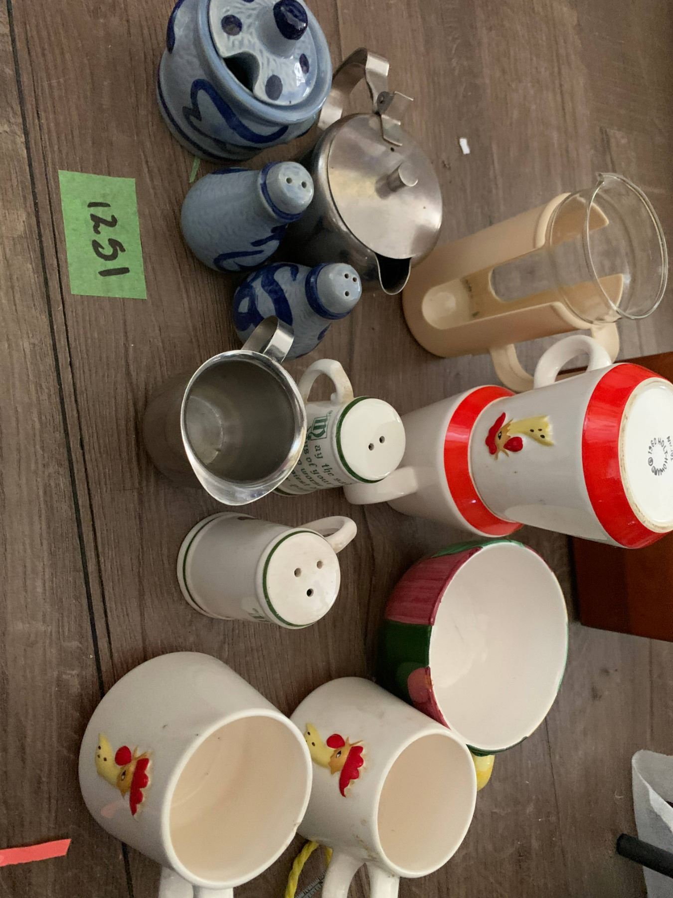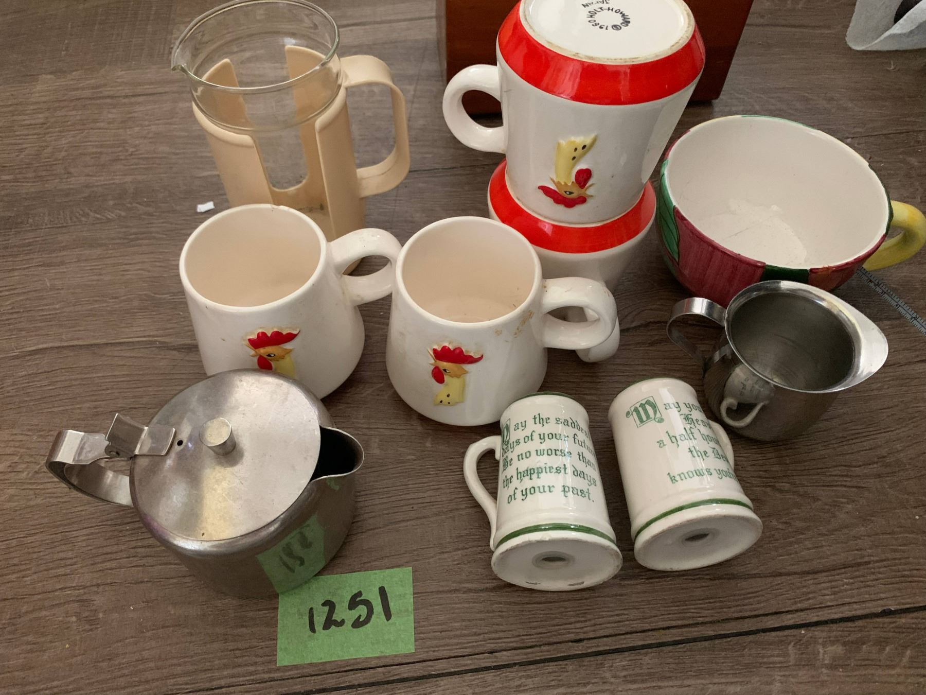 1960/1970 table ware chicken mugs made in Japan, resturaunt metal tea holder, pyrex milk jug