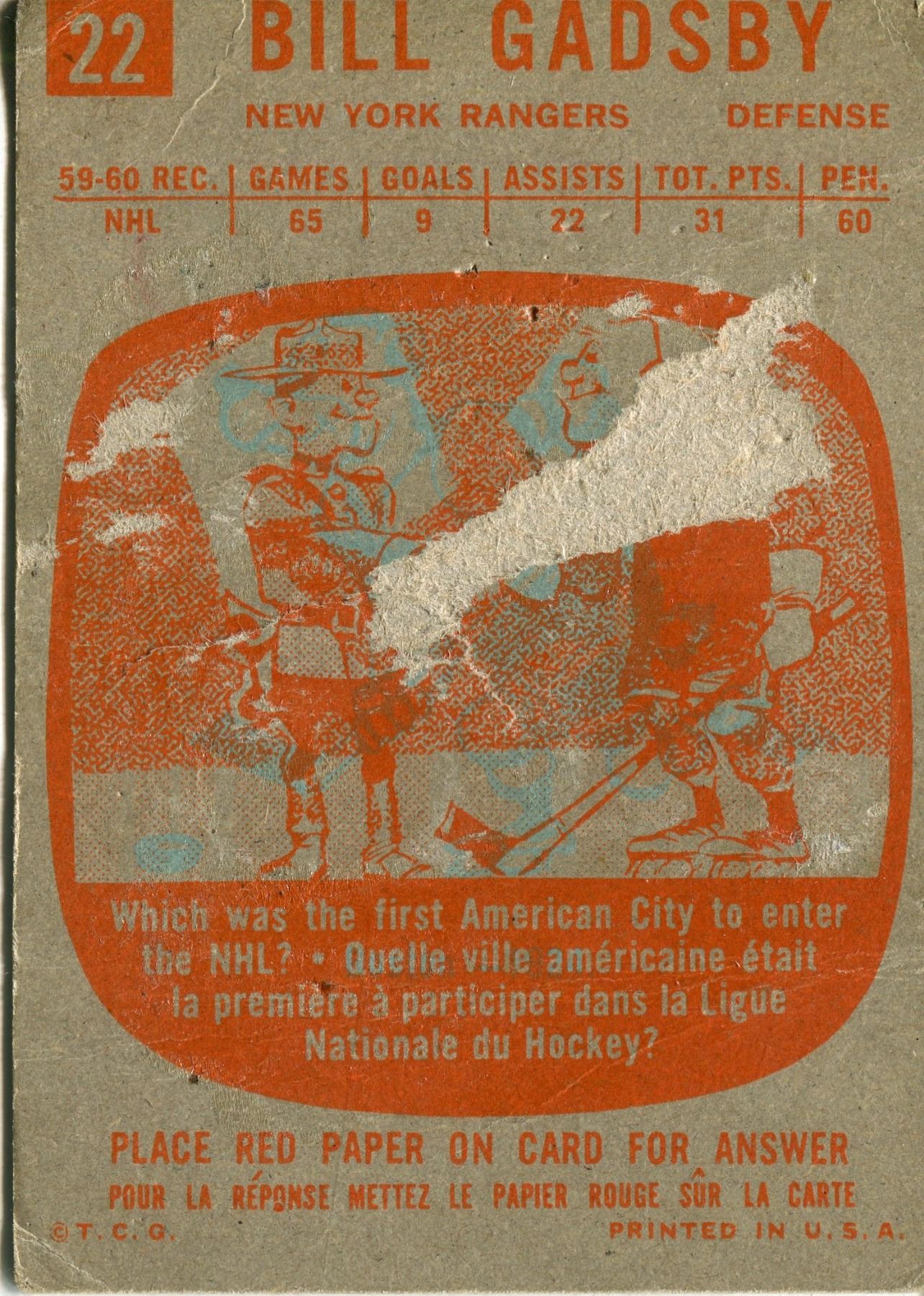 1960/61 TOPPS CARD BILL GADSBY