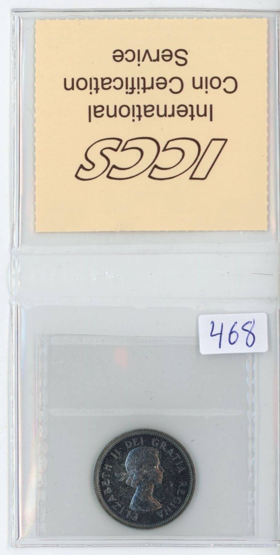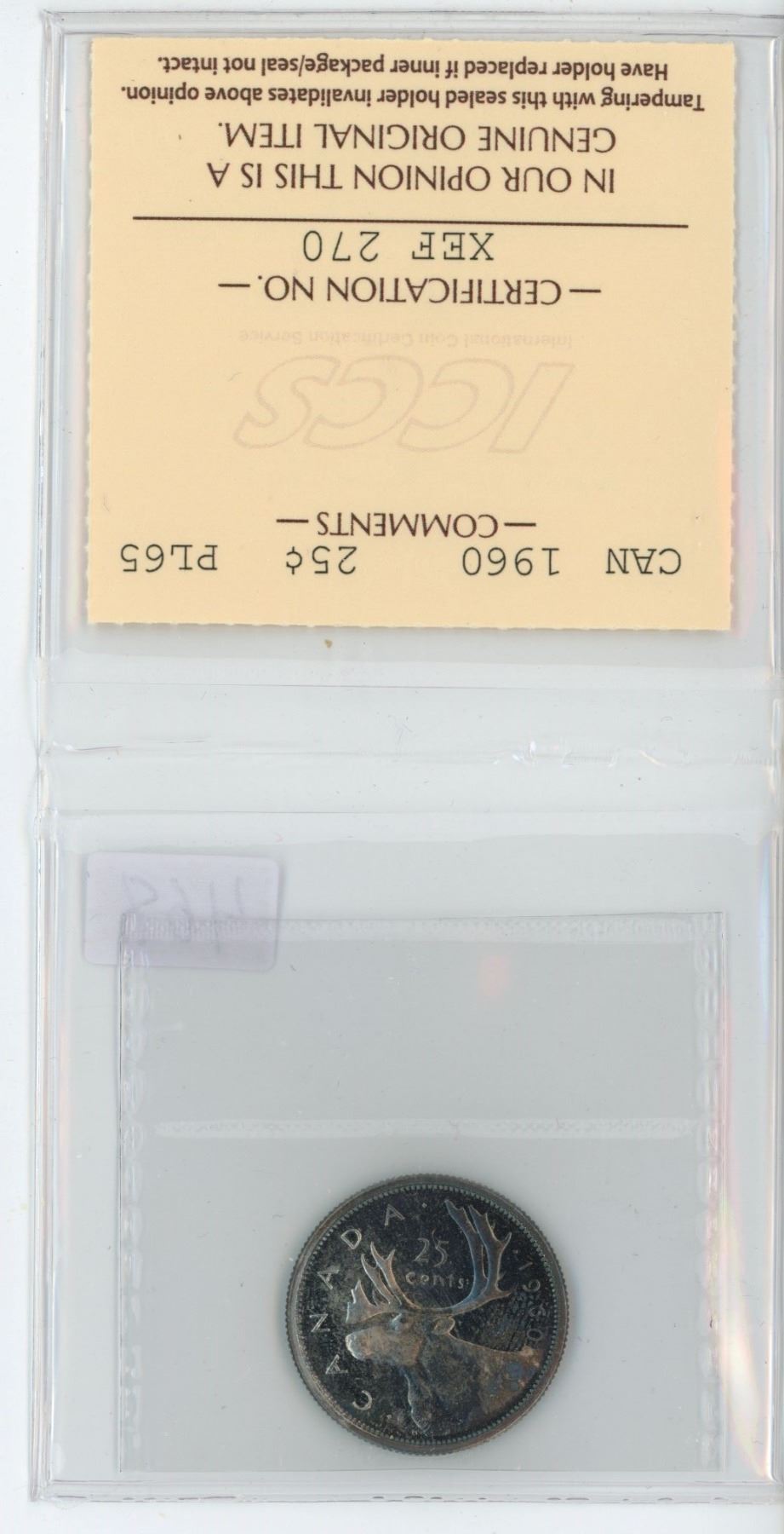 1960 Canadian Silver 25 Cents. ICCS certified and graded PL-65. Nicely Toned.