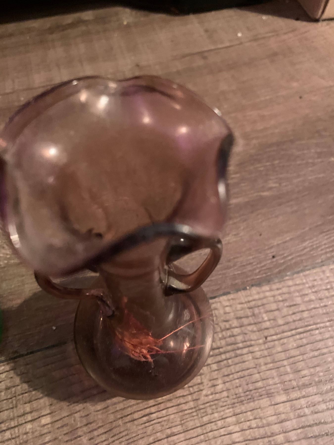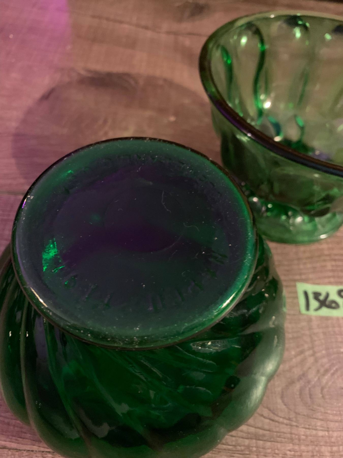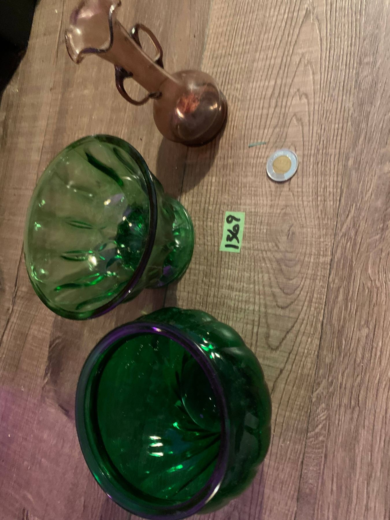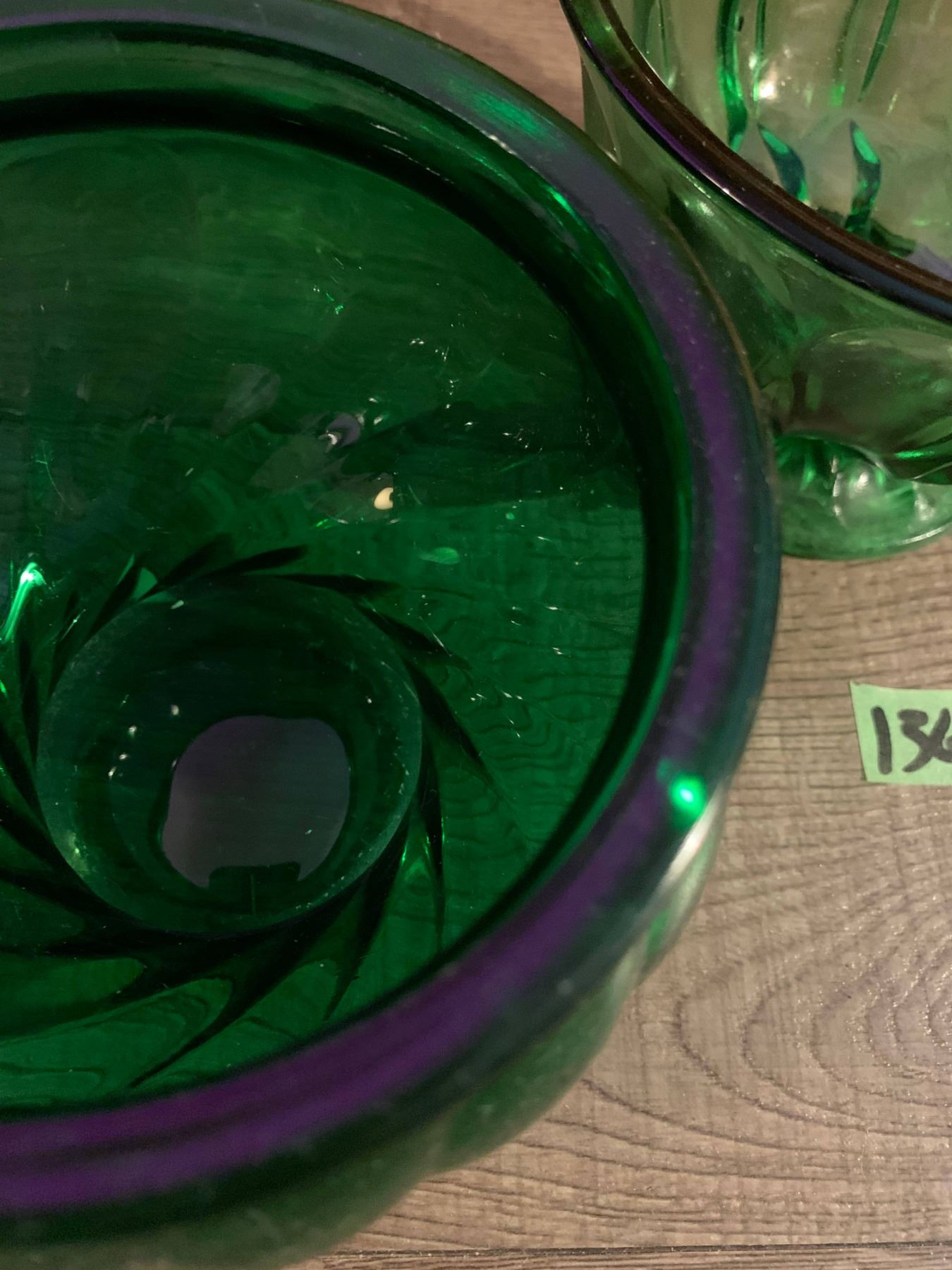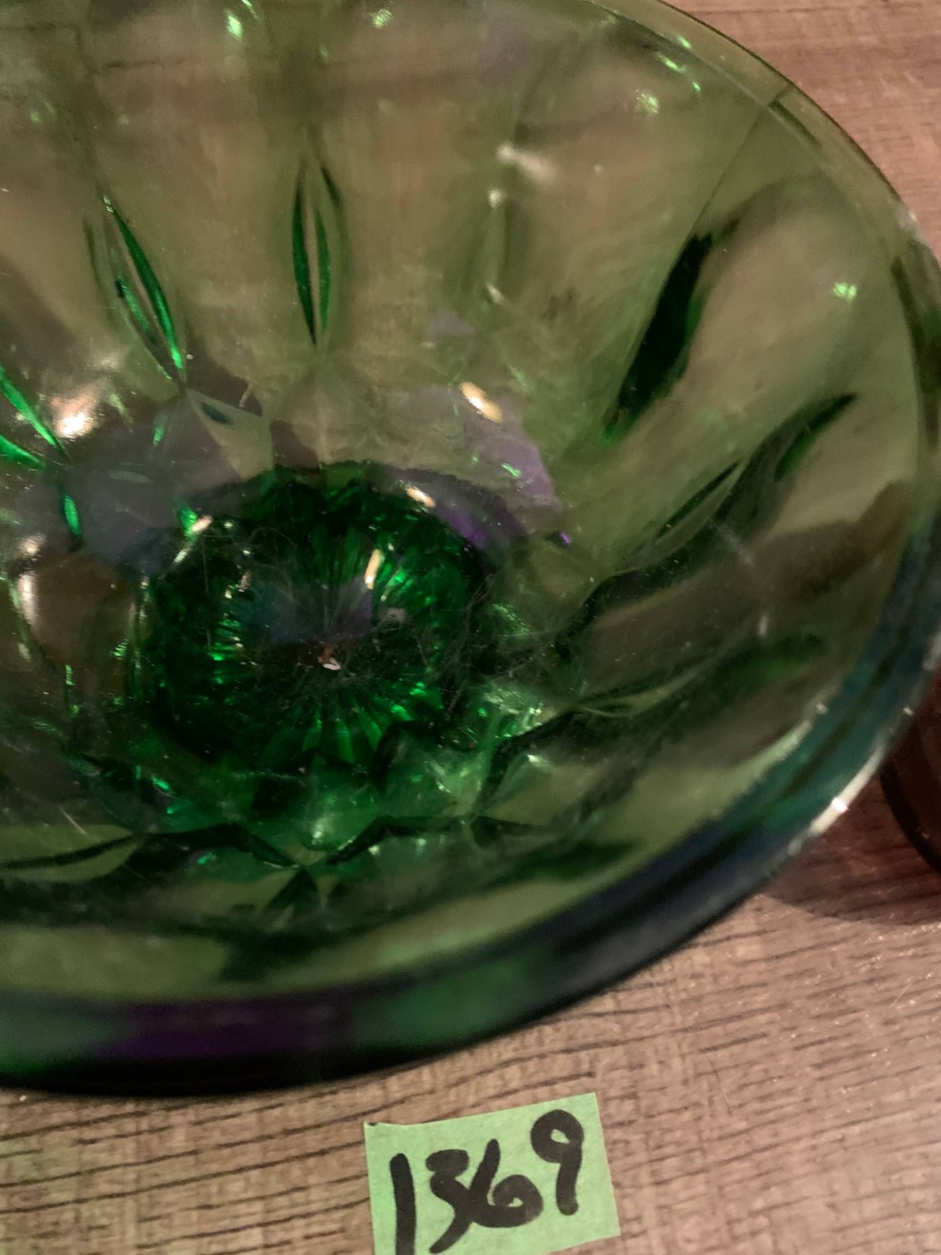 1960 green cut glass bowls- small rose coloured glass vase five inches