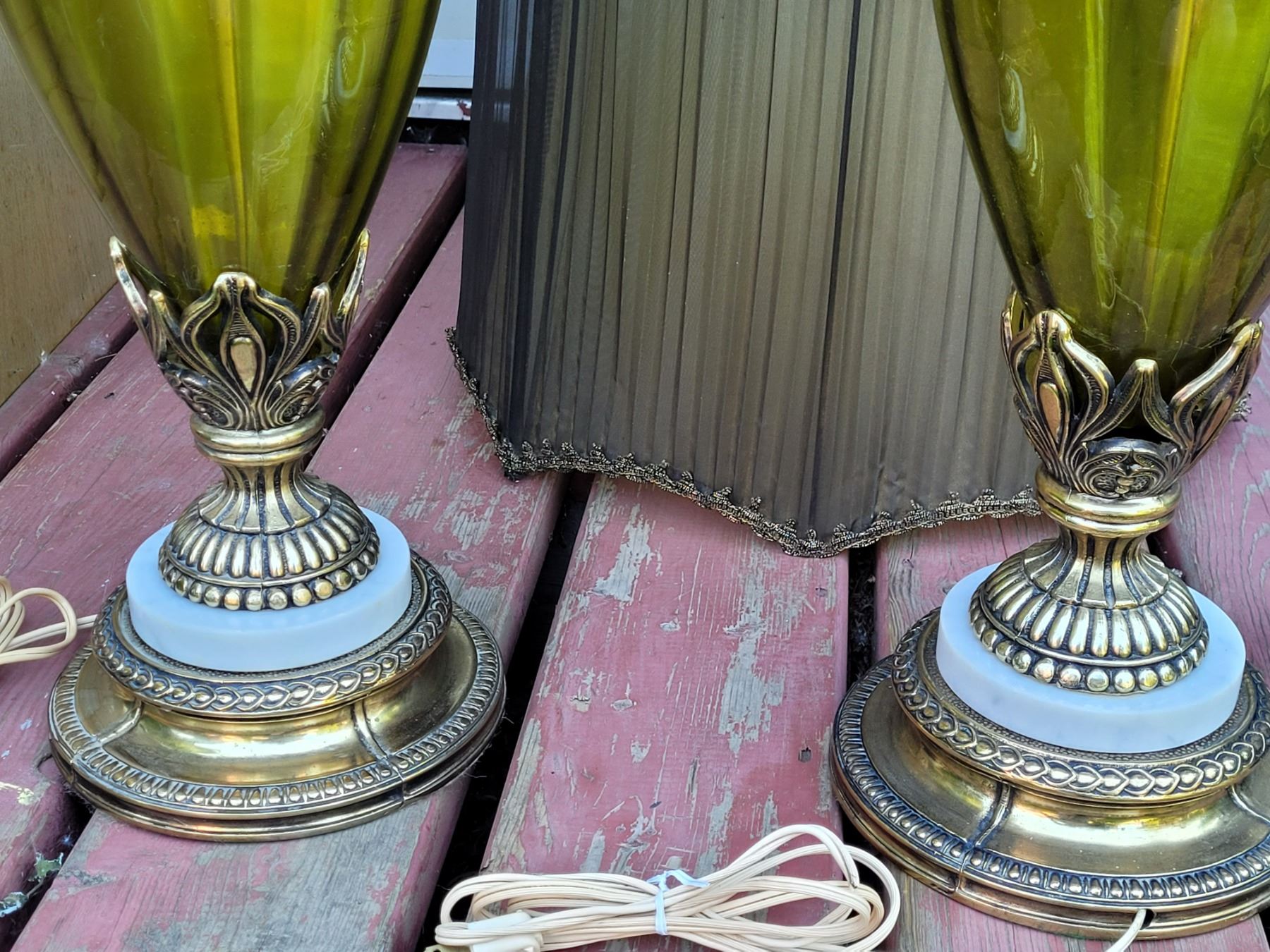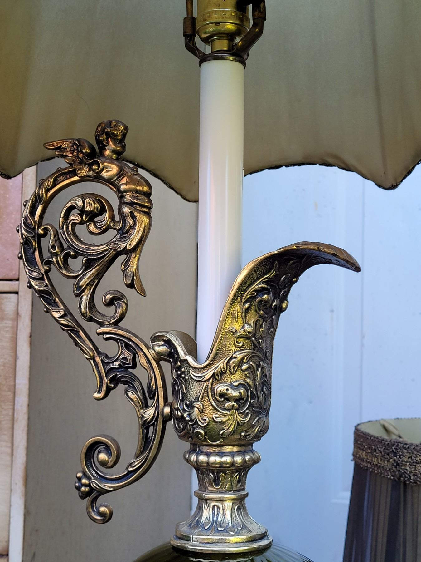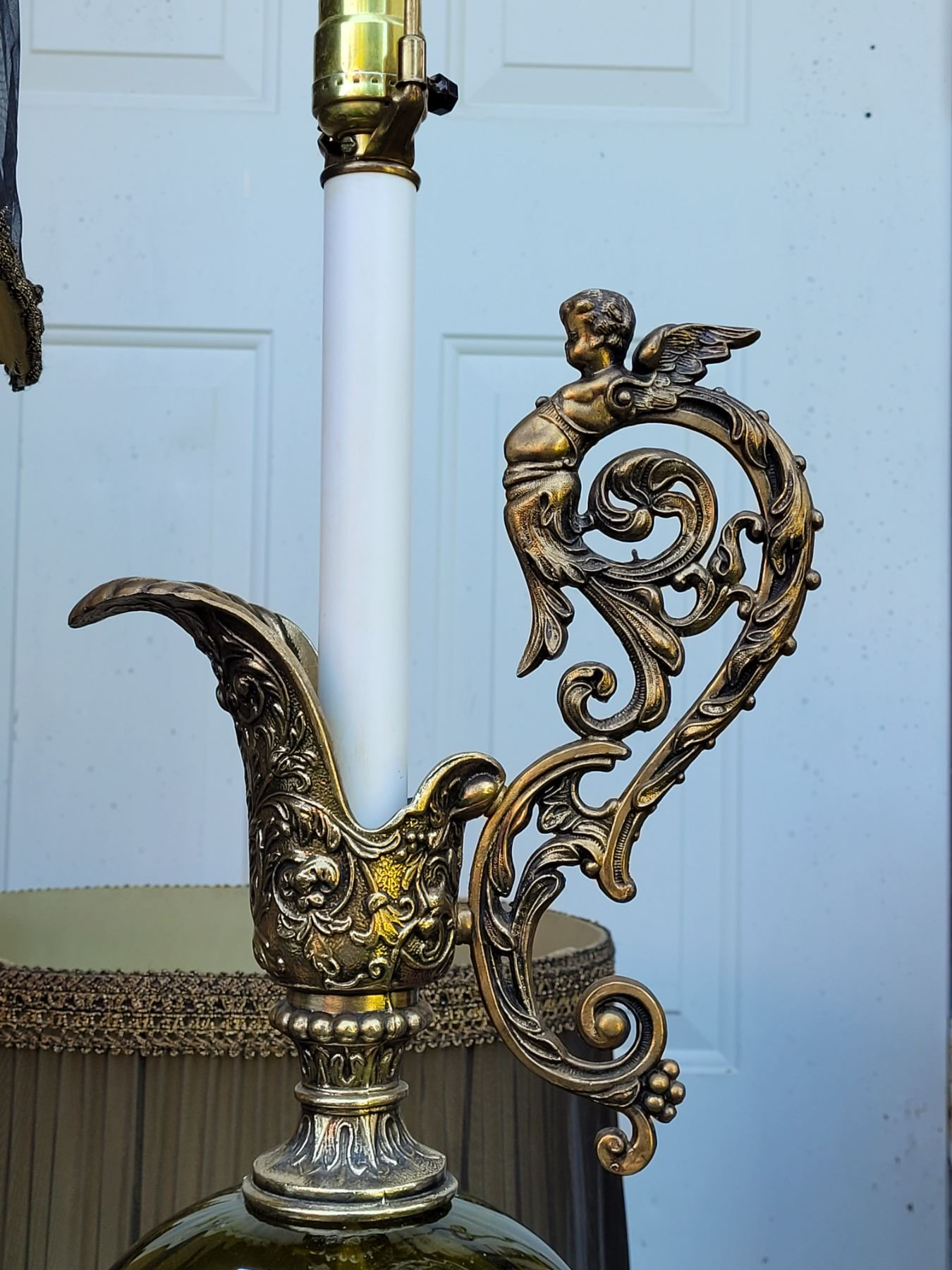 1960's-'70's olive green, brass cherub, water pitcher style, Tri-lite lamps with original shades.