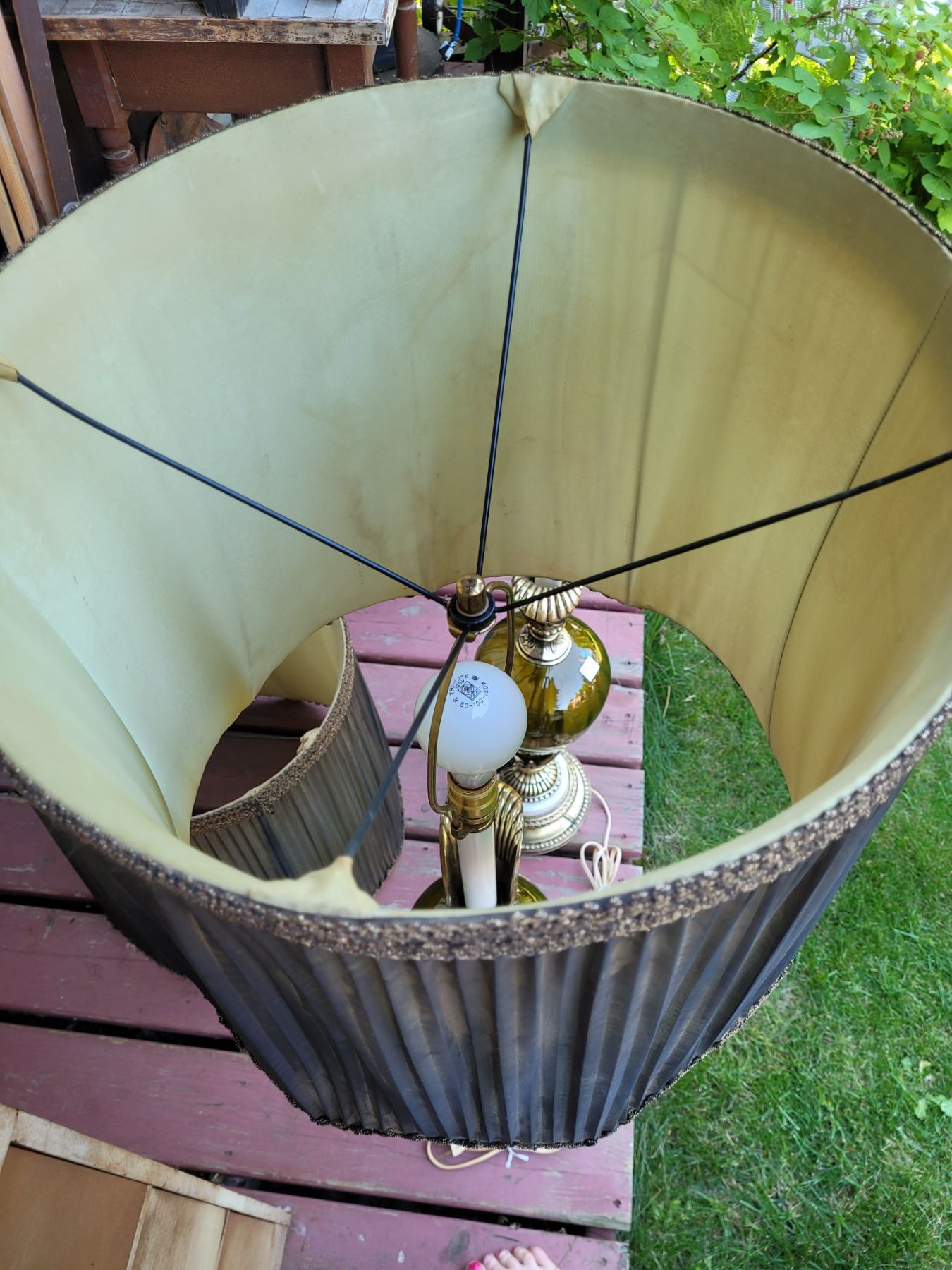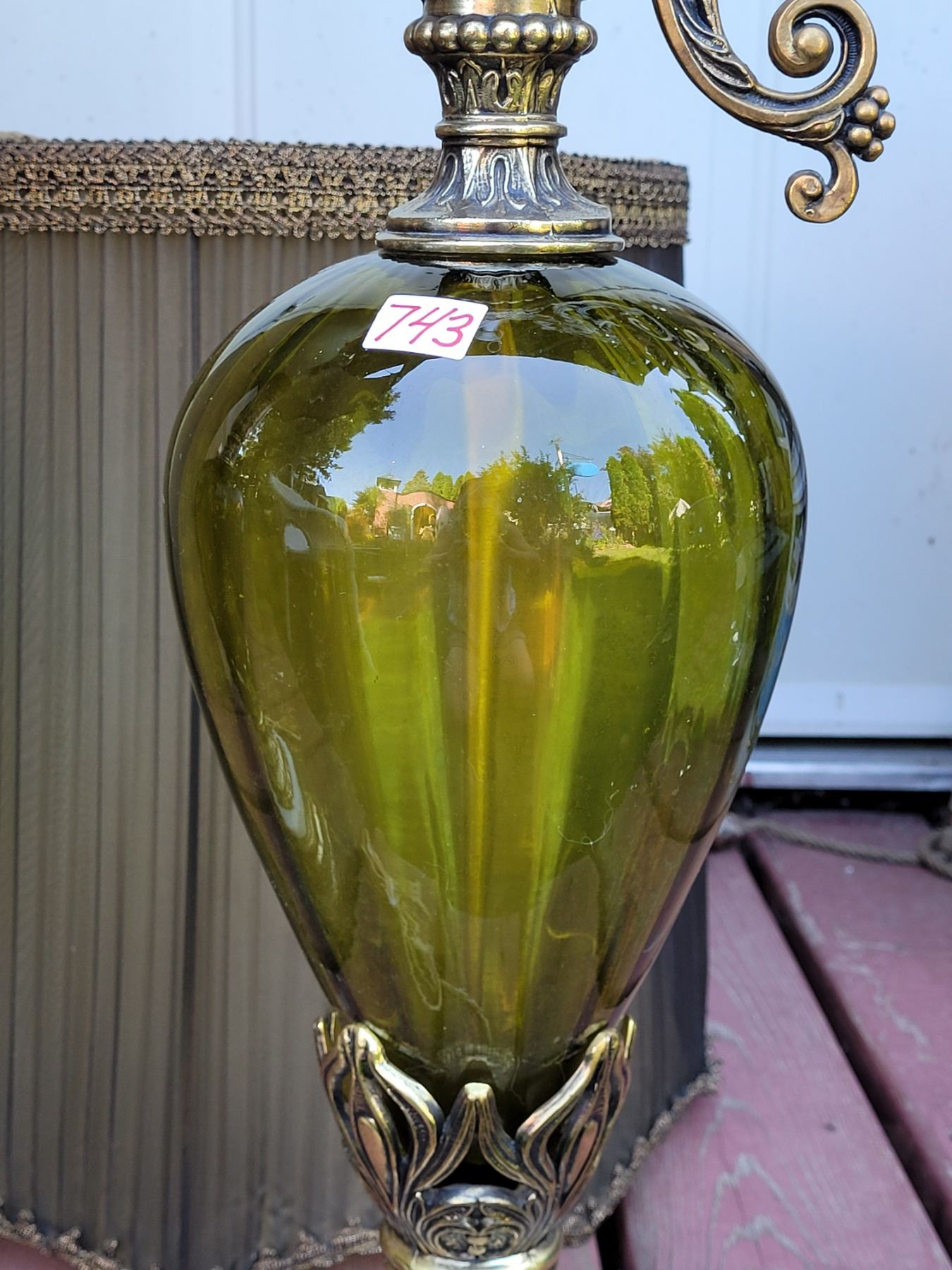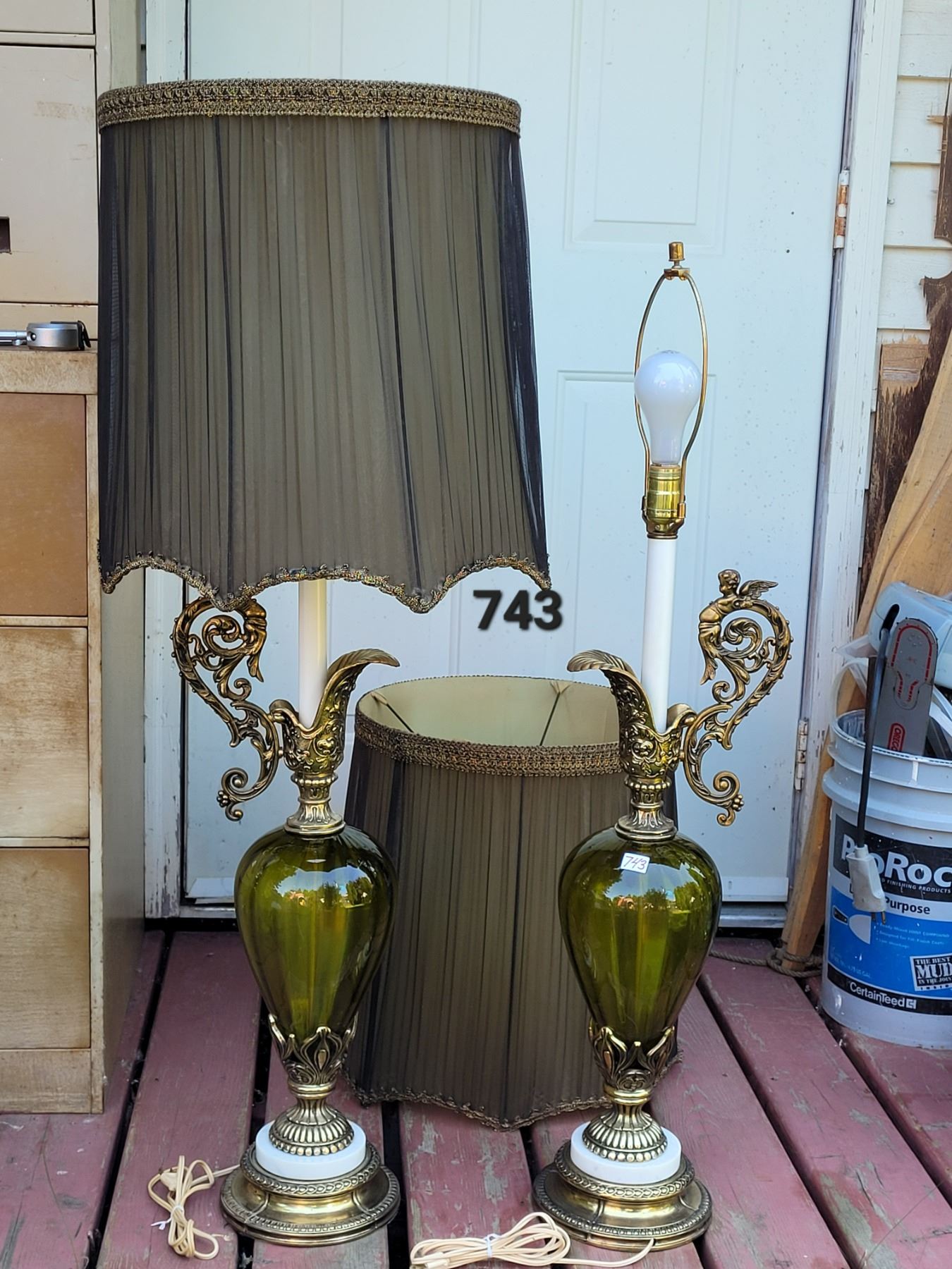 1960's-'70's olive green, brass cherub, water pitcher style, Tri-lite lamps with original shades.
