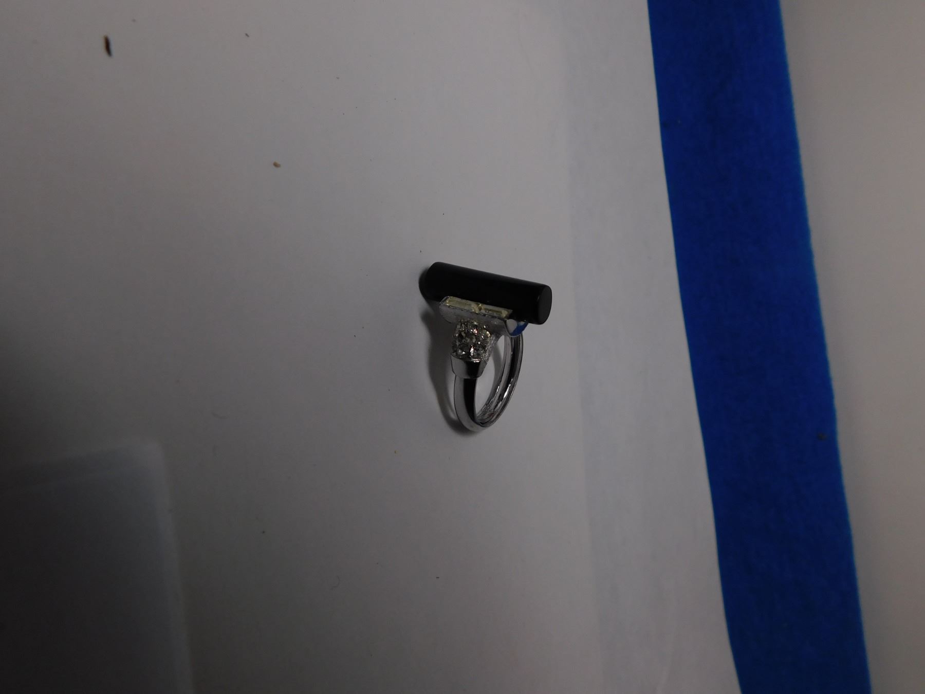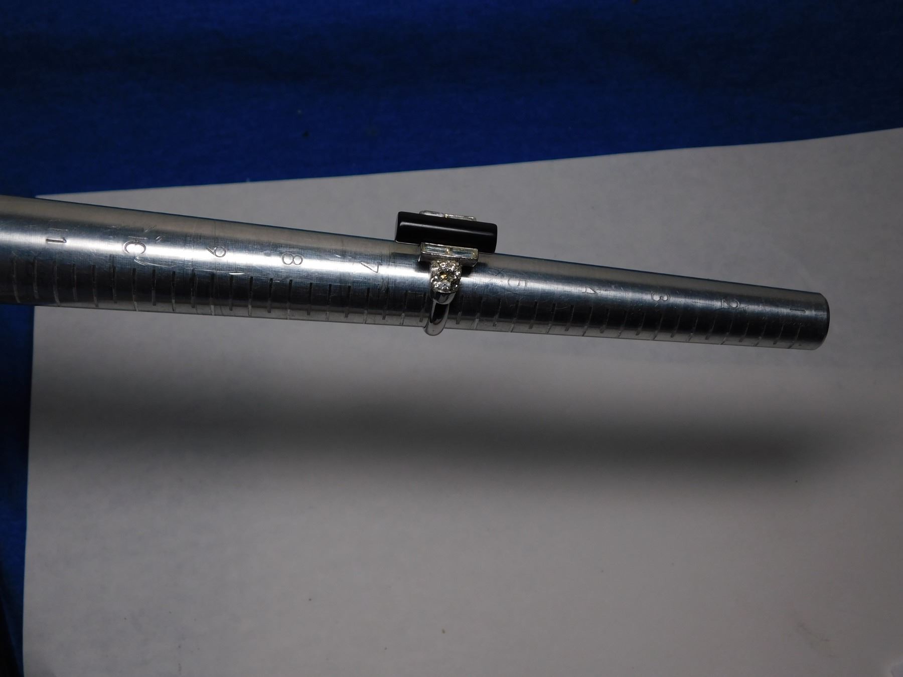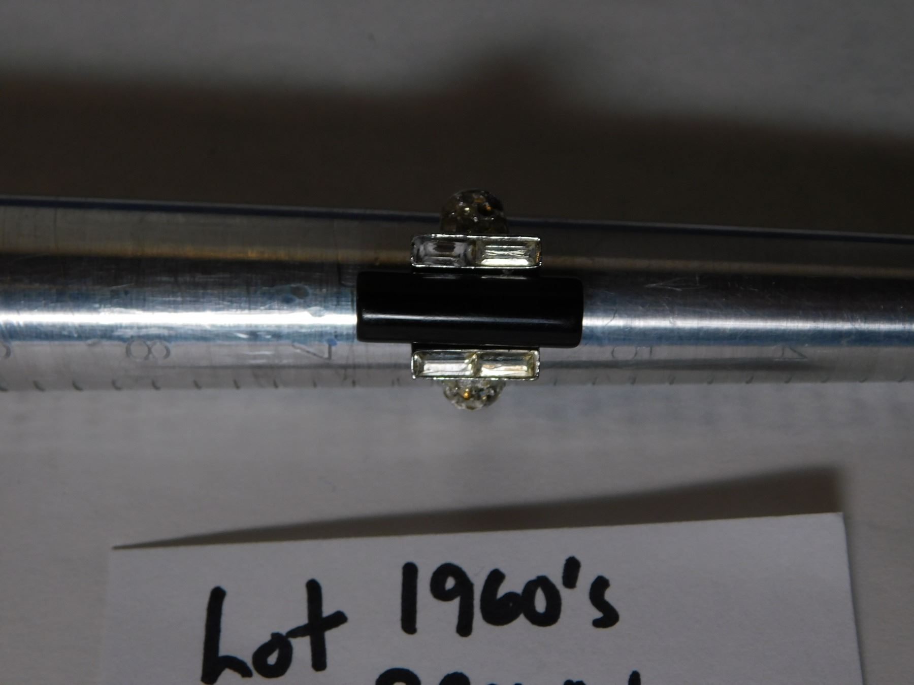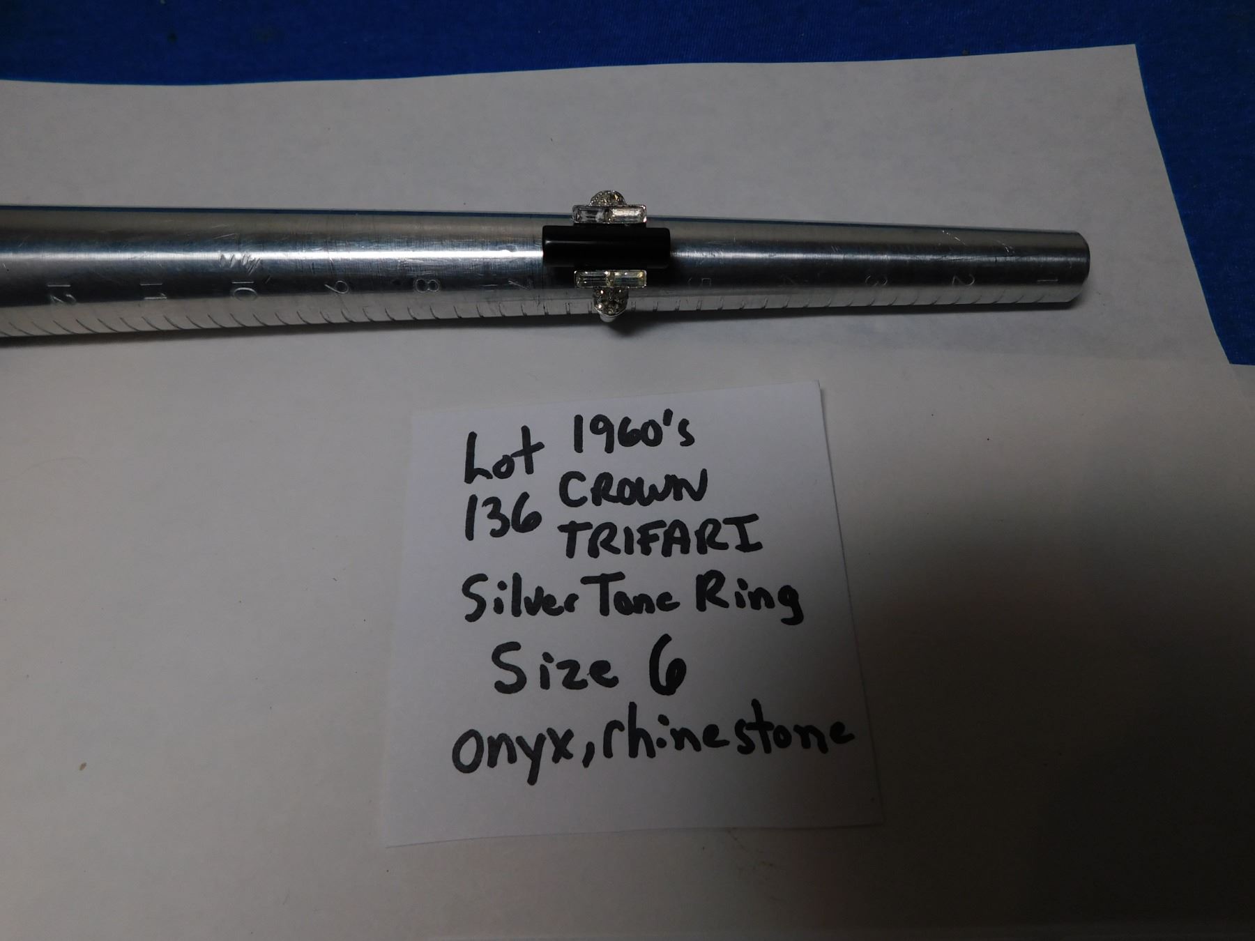 1960S CROWN TRIFARI SILVERTONE ONYX AND RHINESTONE RING SIZE 6