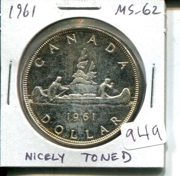 1961 Canadian Silver Dollar. MS-62. Nicely Toned.