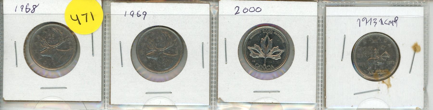 1963, 1969, 2000, 1973 Canadian 25 Cents Coins.
