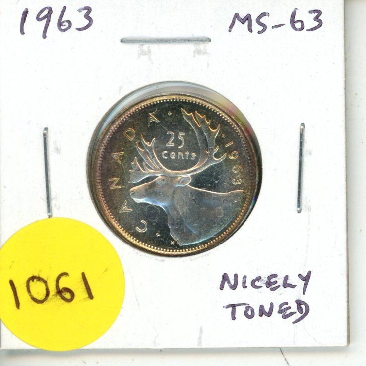 1963 Canadian Silver 25 Cents. MS-63. Nicely Toned.