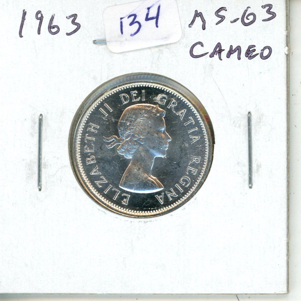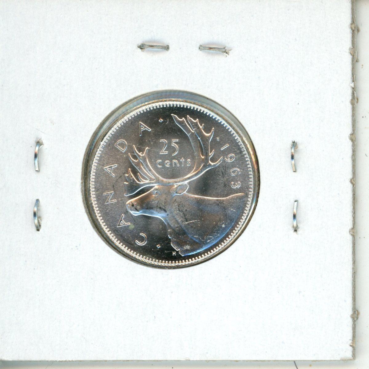 1963 Canadian Silver 25 Cents. MS-63 with Cameo. Bright White.