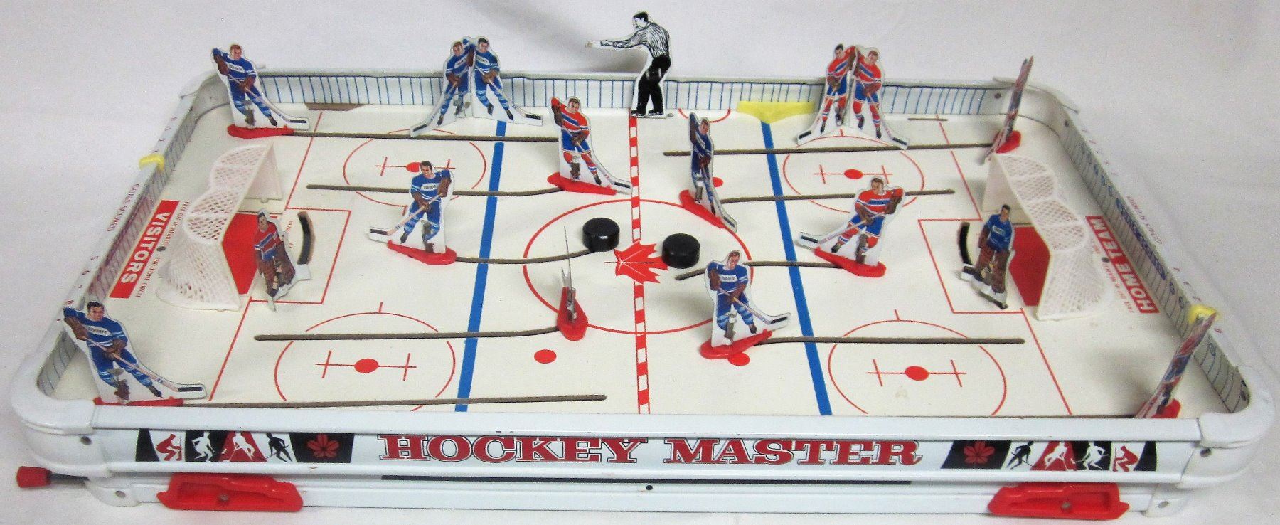 1963 Hockey master table top hockey game. Munroe Canada, Montreal & Toronto players, referee, 2 pucks.