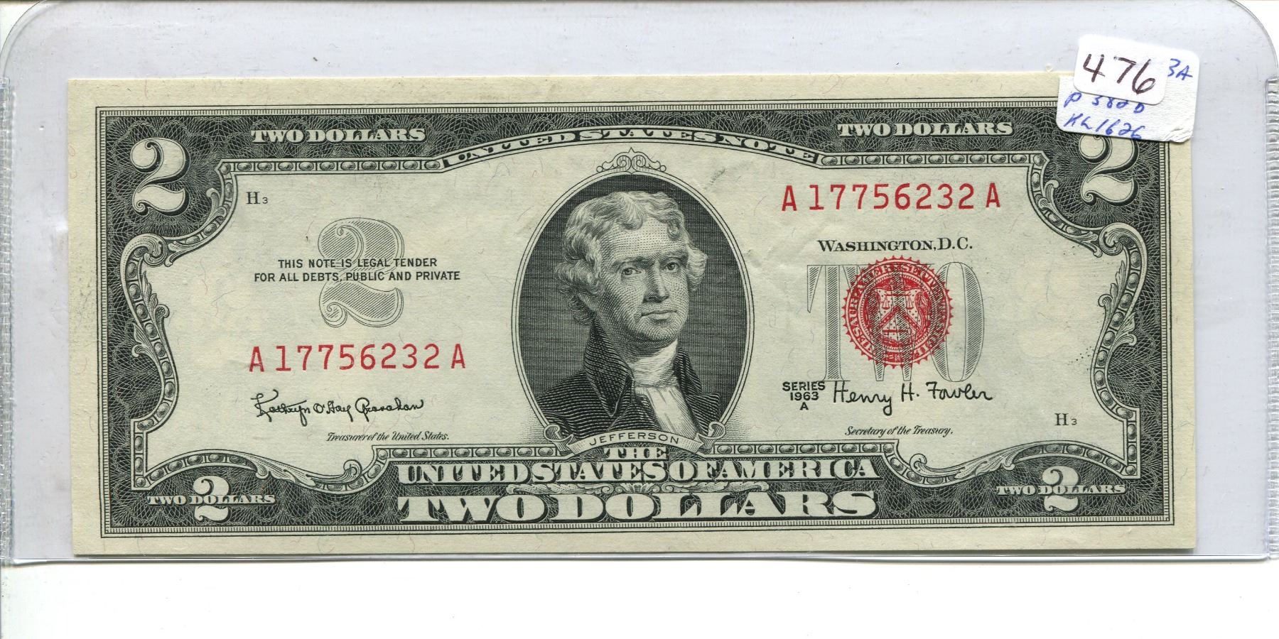 1963 USA Series A Red Seal AU $2 bill, Graham/Fowler, A 17756232 A