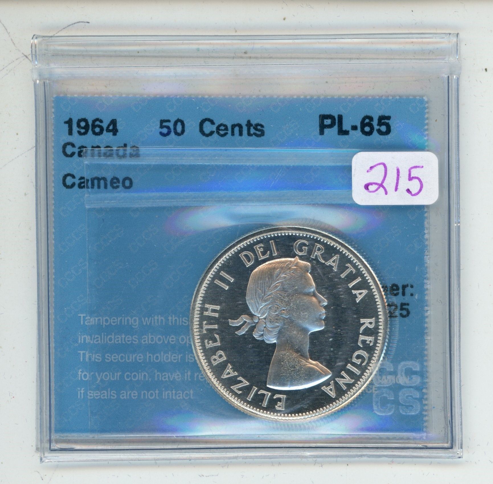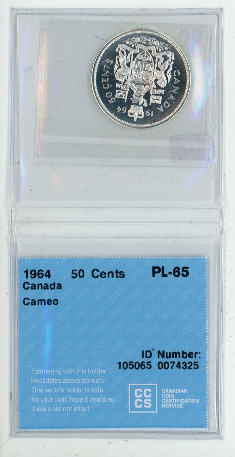 1964 CCCS graded, Canadian silver 50 cent coin - PL65