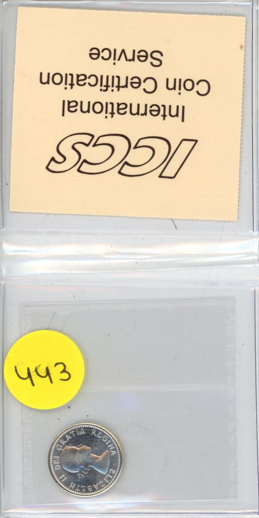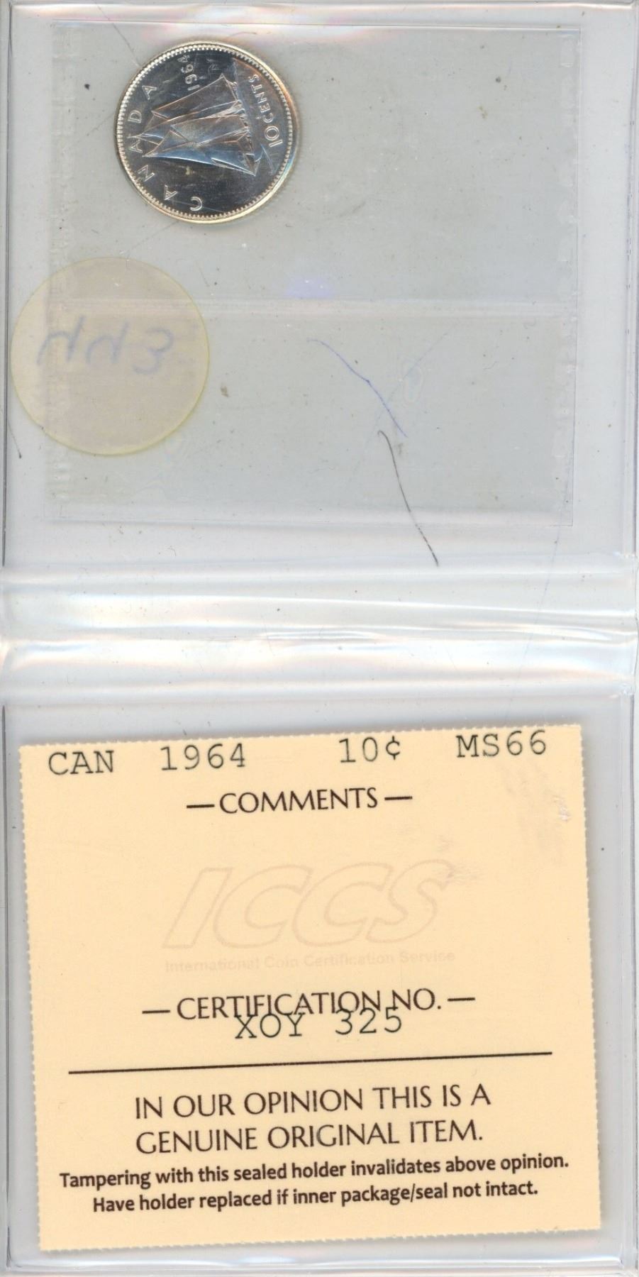1964 Canadian Silver 10 Cents. ICCS certified and graded MS66. Bright White.