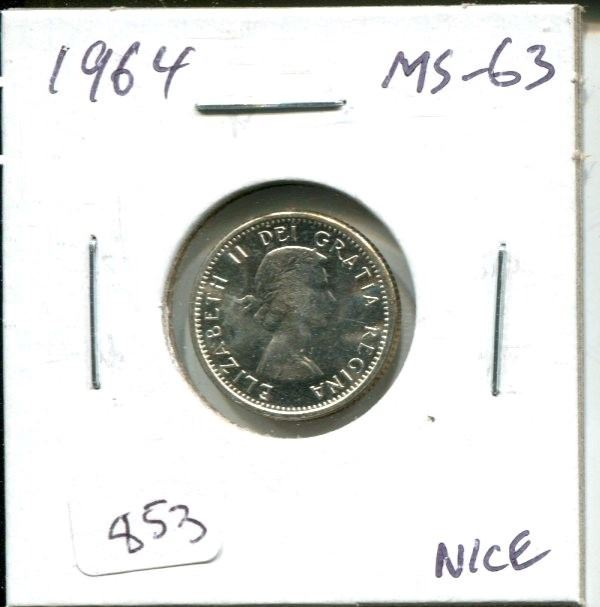 1964 Canadian Silver 10 Cents. MS-63. Bright White. Nice.