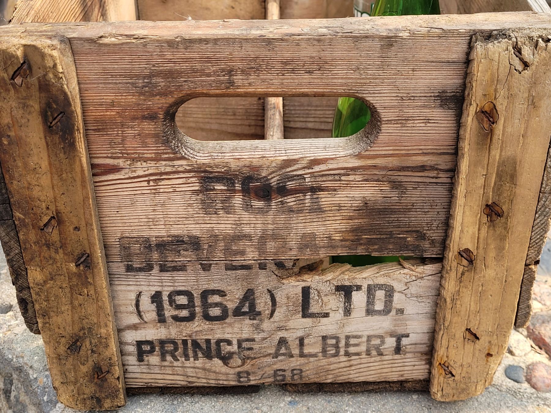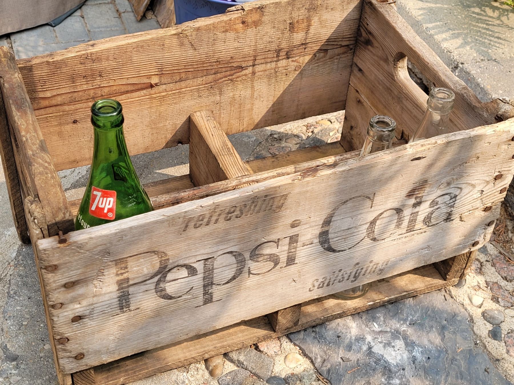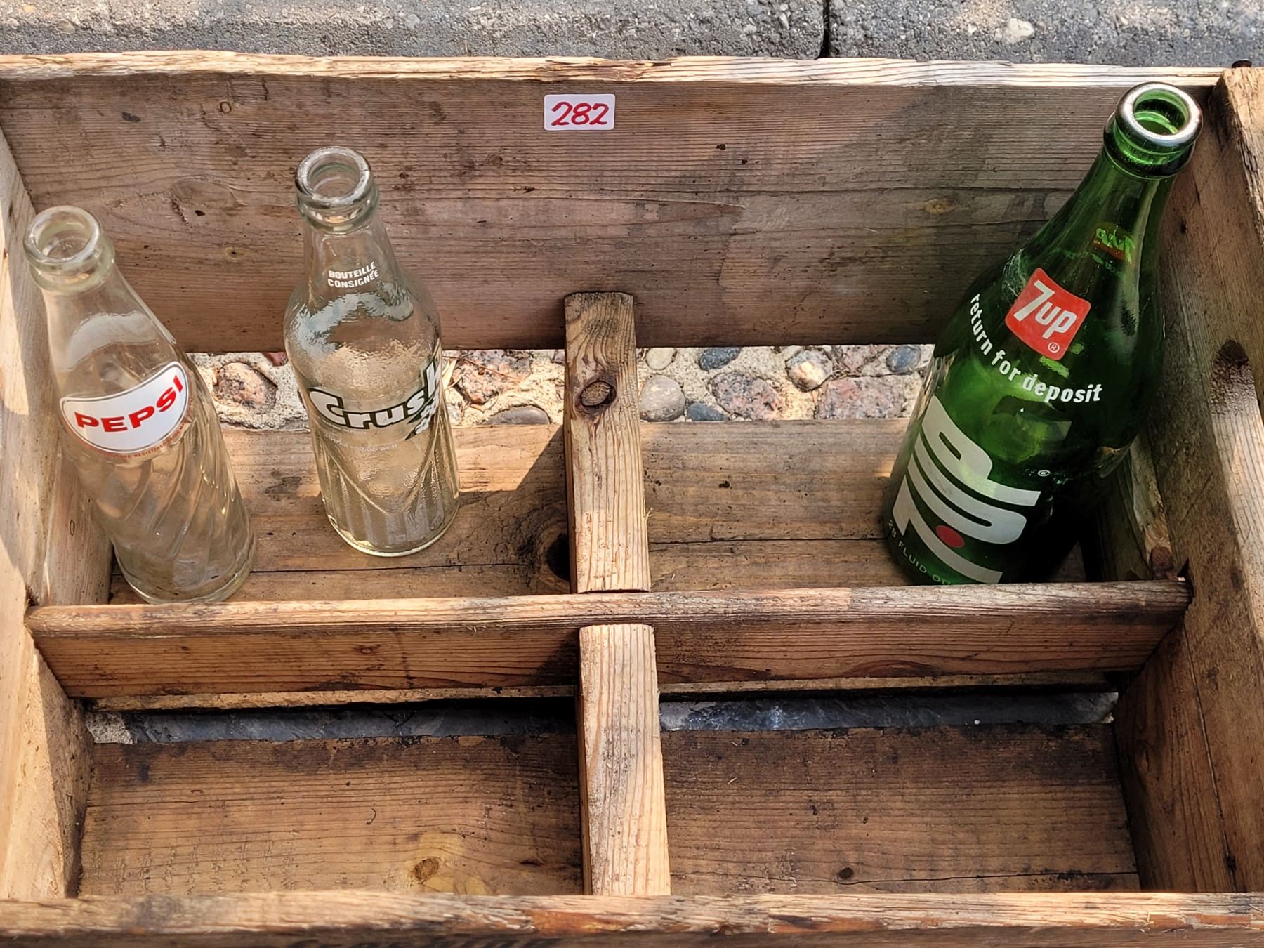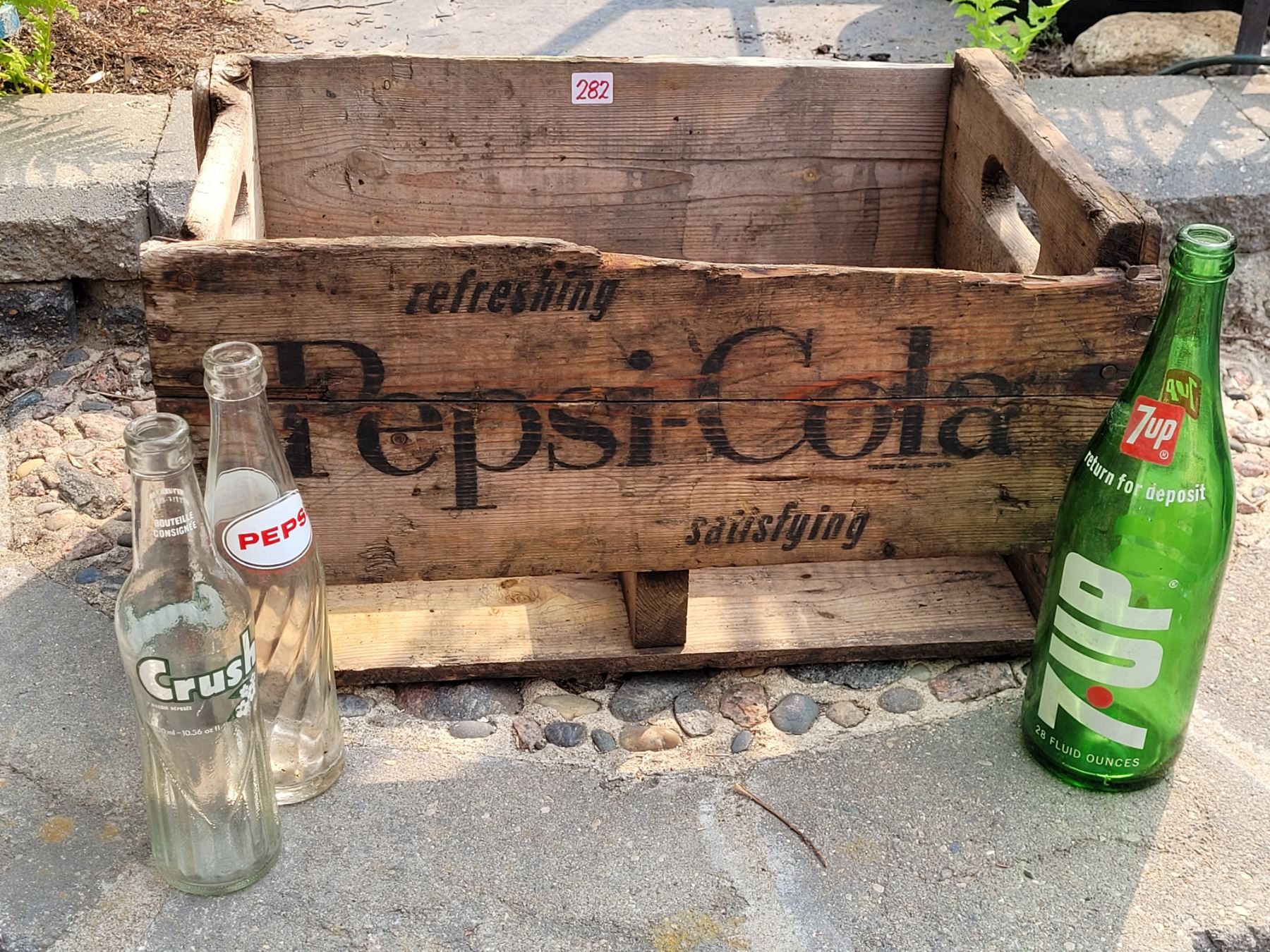 1964 wood Pepsi crate with vintage Pepsi, Crush & 7up glass bottles.