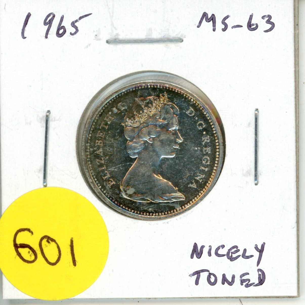 1965 Canadian Silver 25 Cents. MS-63. Nicely Toned.