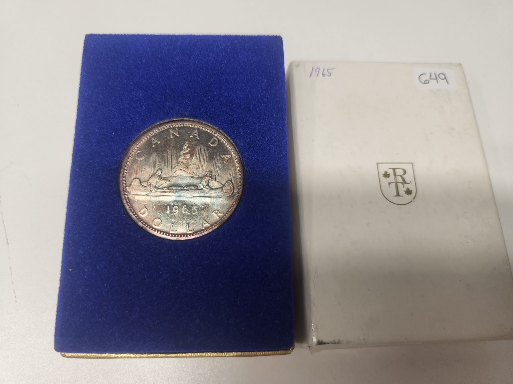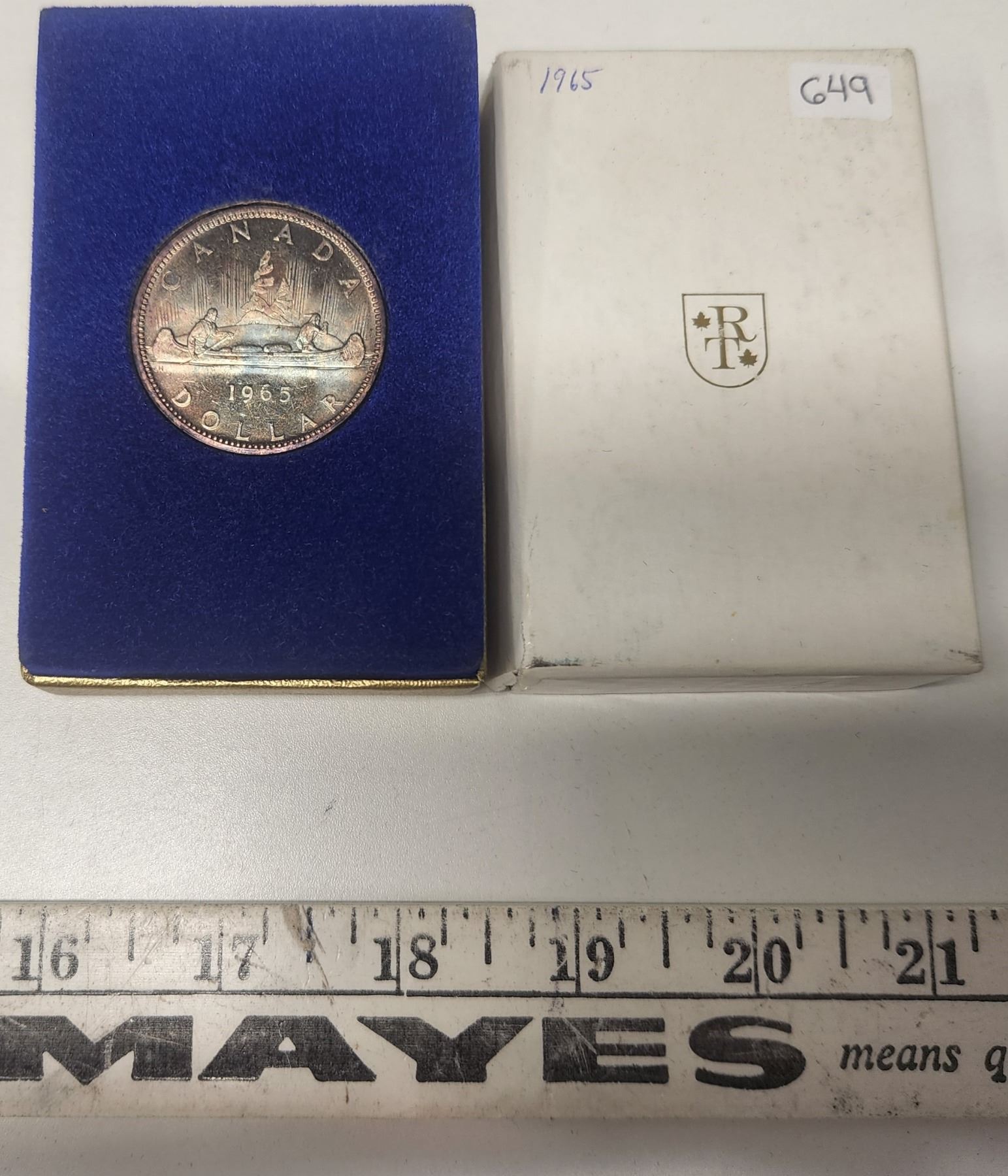 1965 Canadian Silver Dollar. Housed in a Royal Trust box. The coin is beautifully toned.