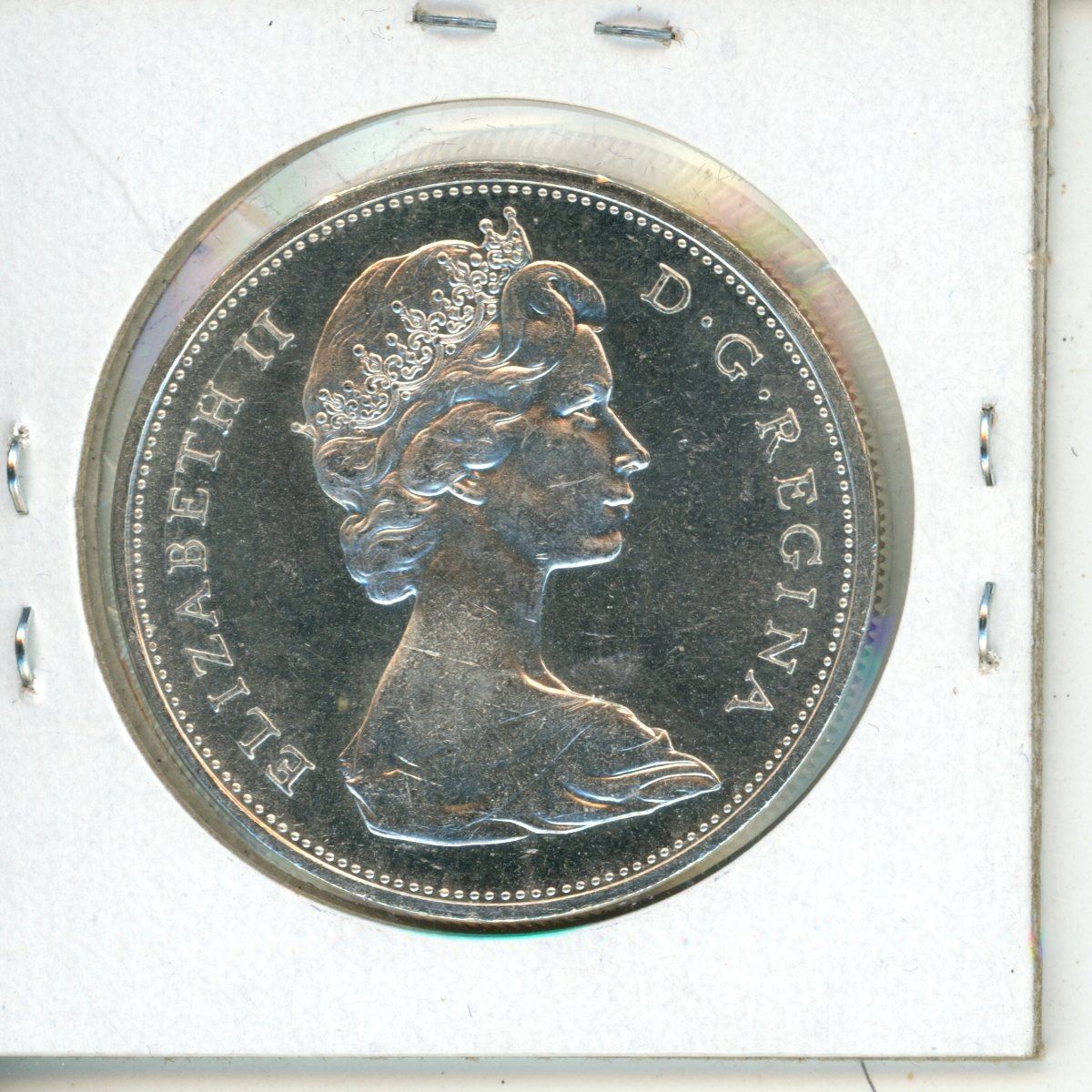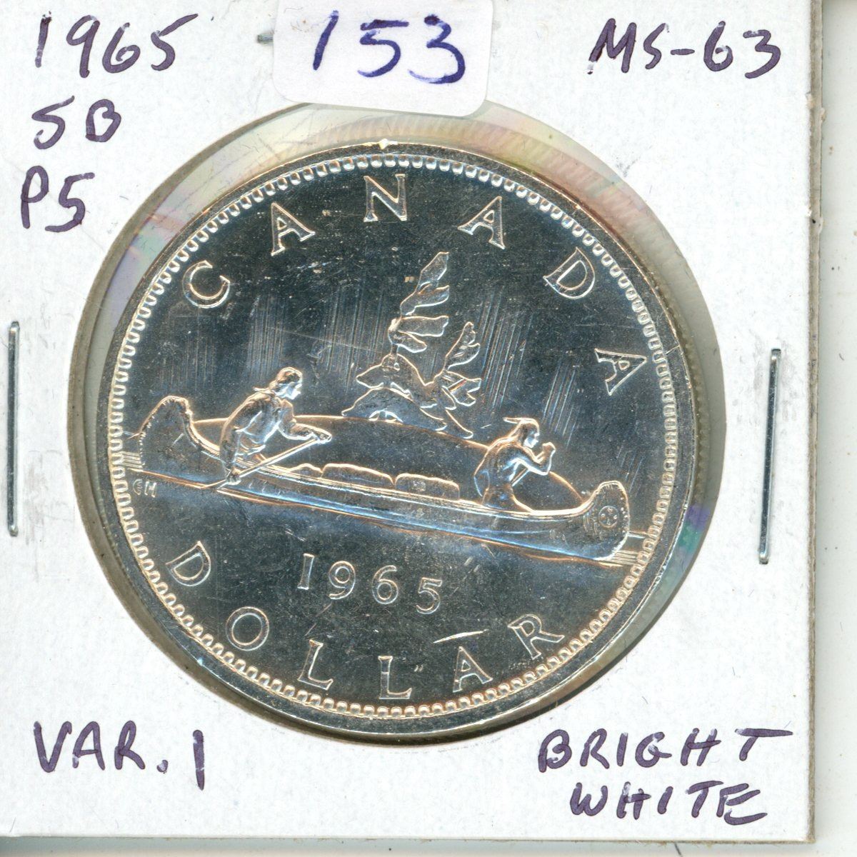 1965 Small Beads, Pointed 5 Canadian Silver Dollar. Variety 1. MS-63. Bright White.