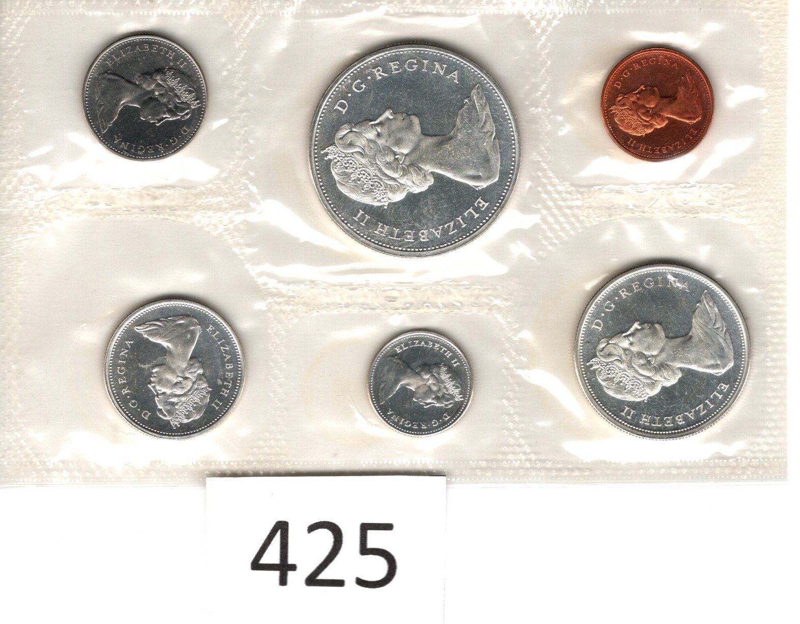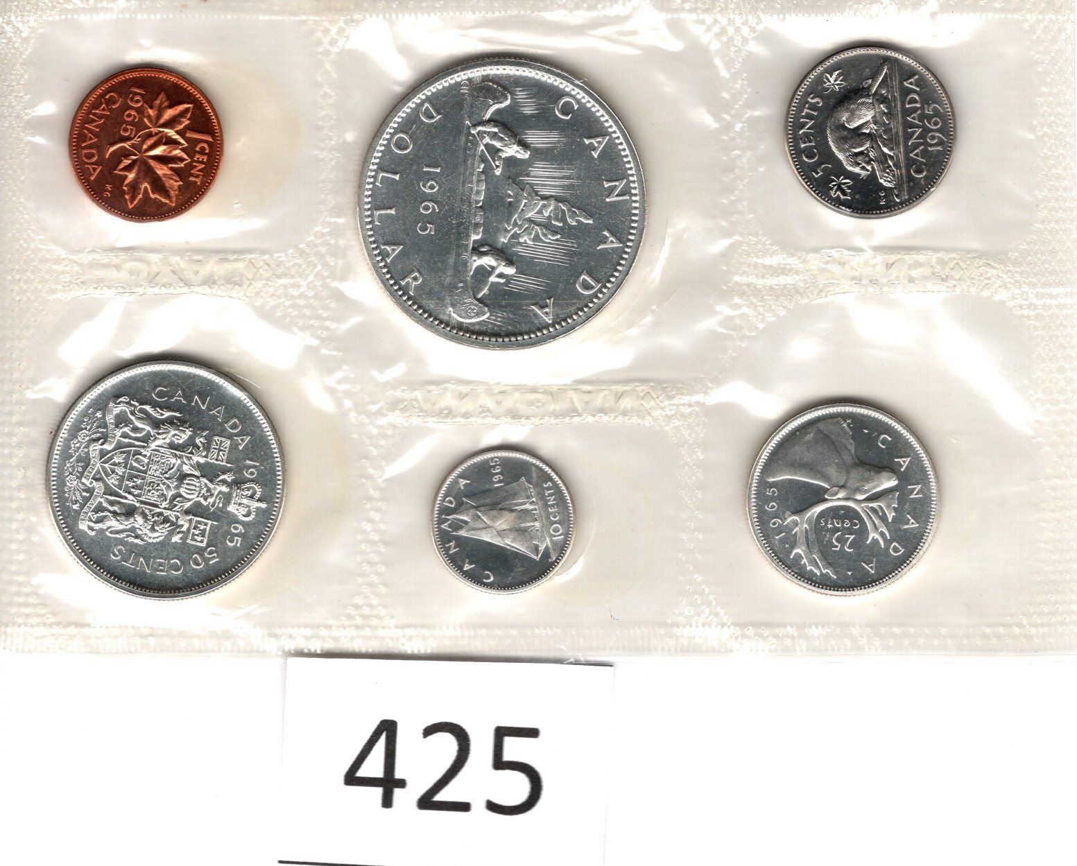 1965 Uncirculated Six Coins Silver Dollar, Fifty Cent Piece, Quarter, Dime, Nickel, Penny