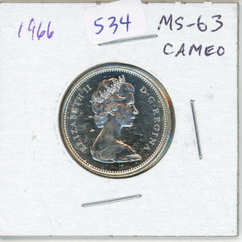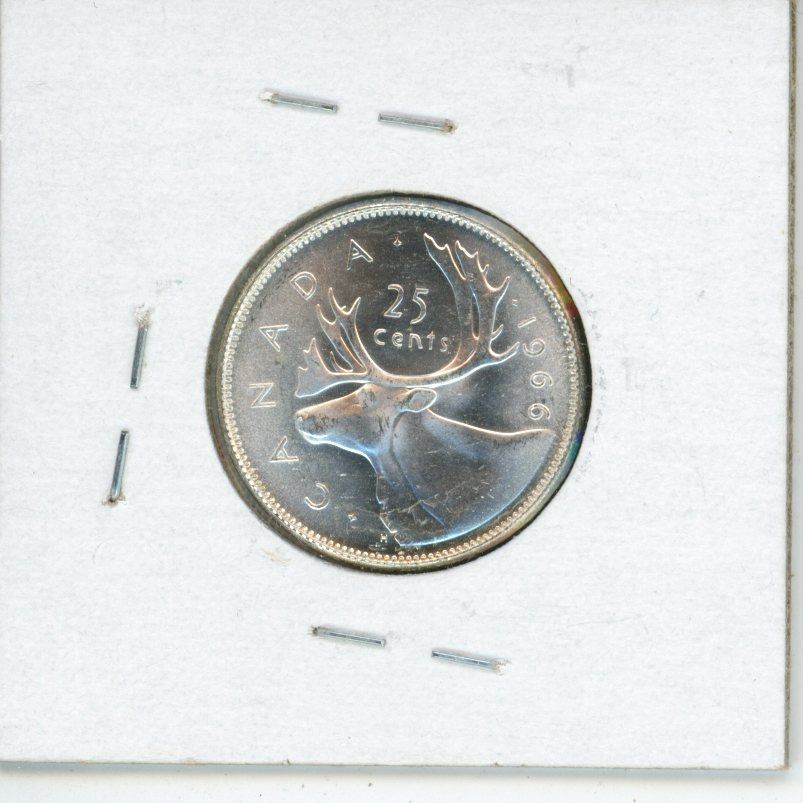 1966 Canadian Silver 25 Cents MS-63 with Cameo. Bright White.