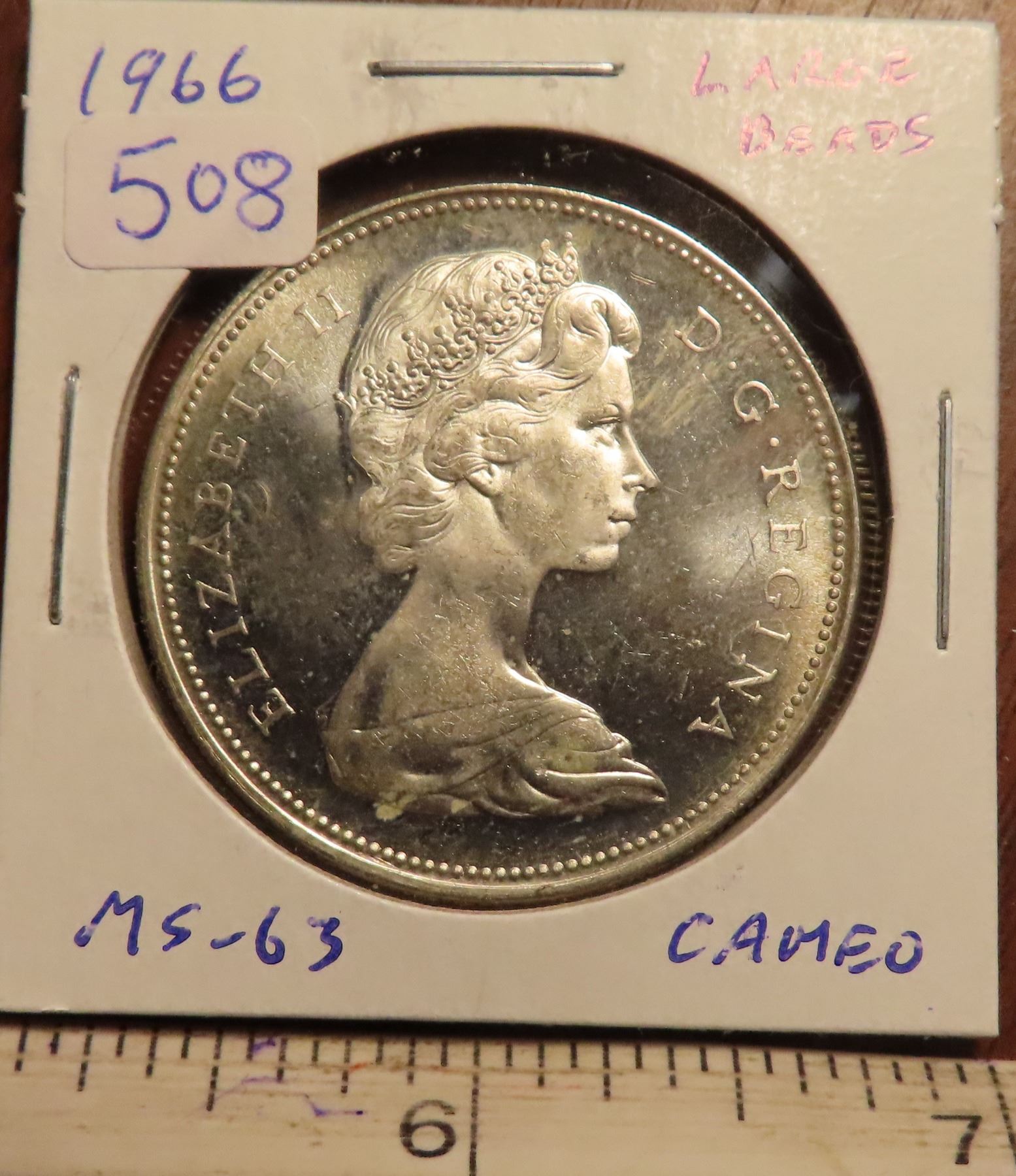 1966 Large Beads Canadian Silver Dollar. MS-63 with Cameo. Lustrous.