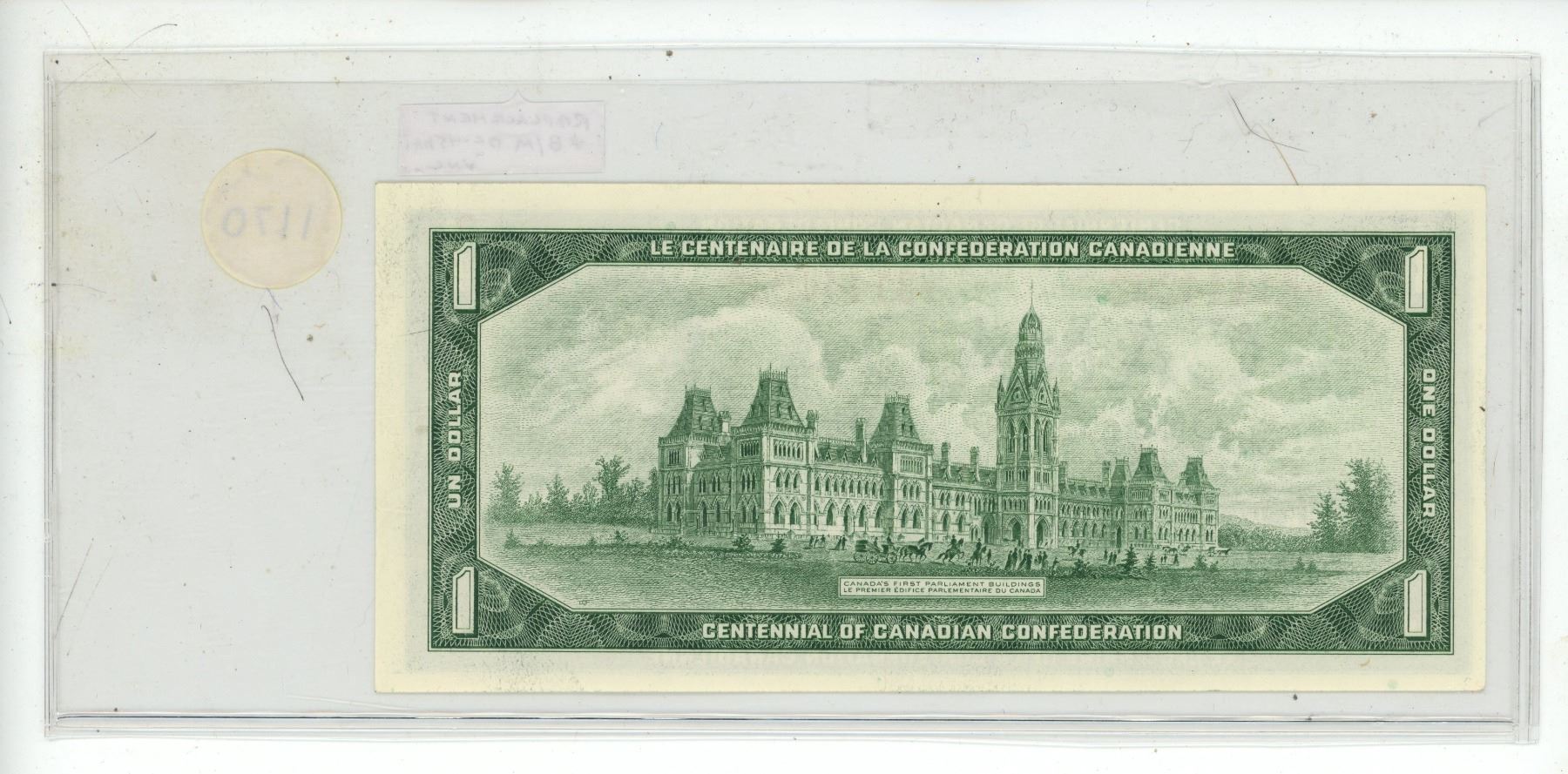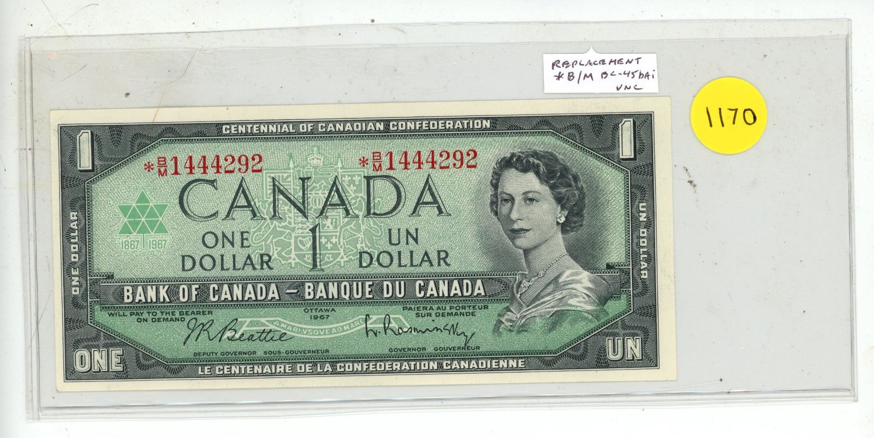 1967 $1 Replacement. Beattie-Rasminsky signatures. *B/M Replacement Prefix. BC-45bAi. Uncirculated.