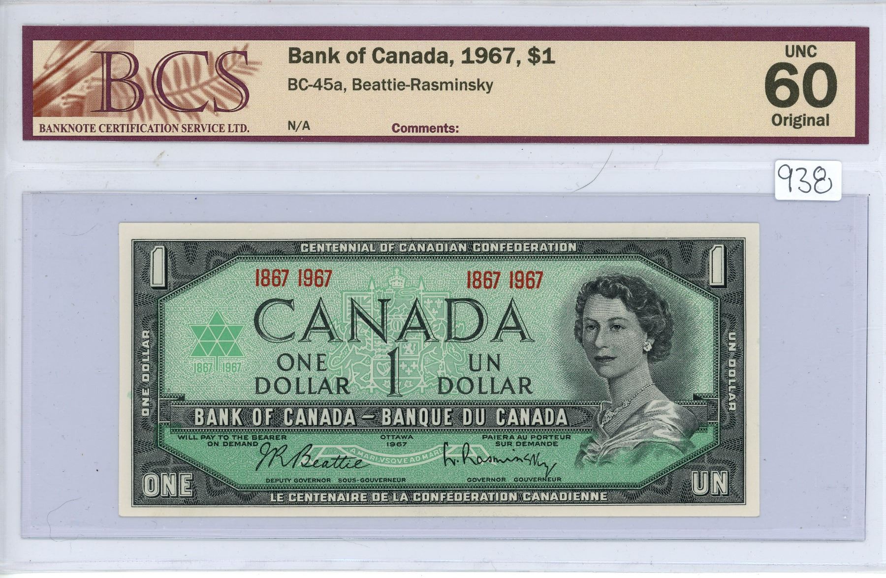 1967 Bank of Canada $1.00 one dollar bill - BCS UNC 60