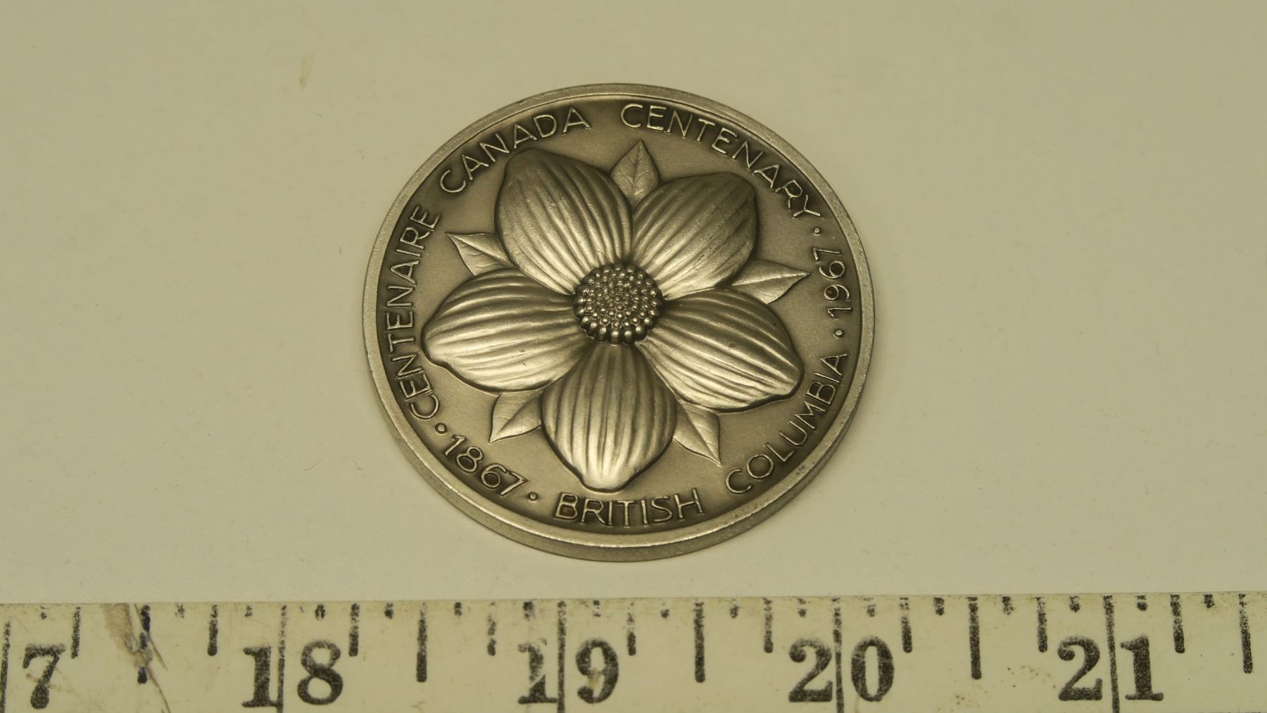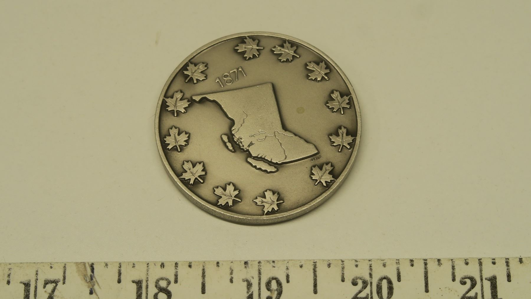 1967 British Columbia Centennial Medal. Huge 50mm Silver Plated medal depicting the provincial flower and map of BC. BU. Scarce.