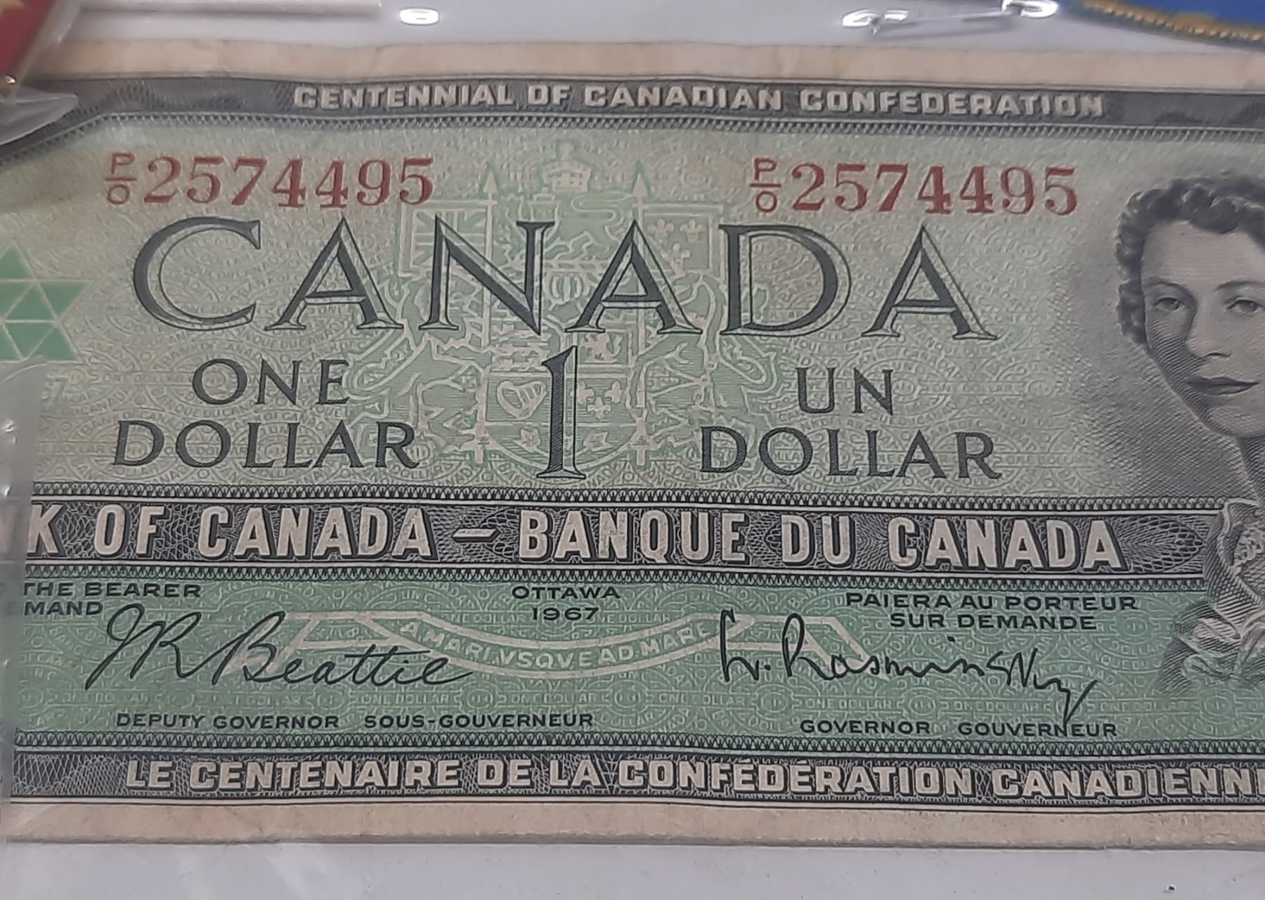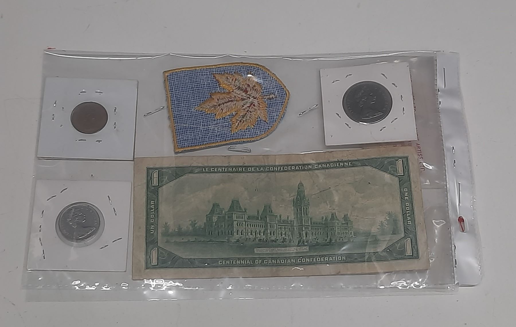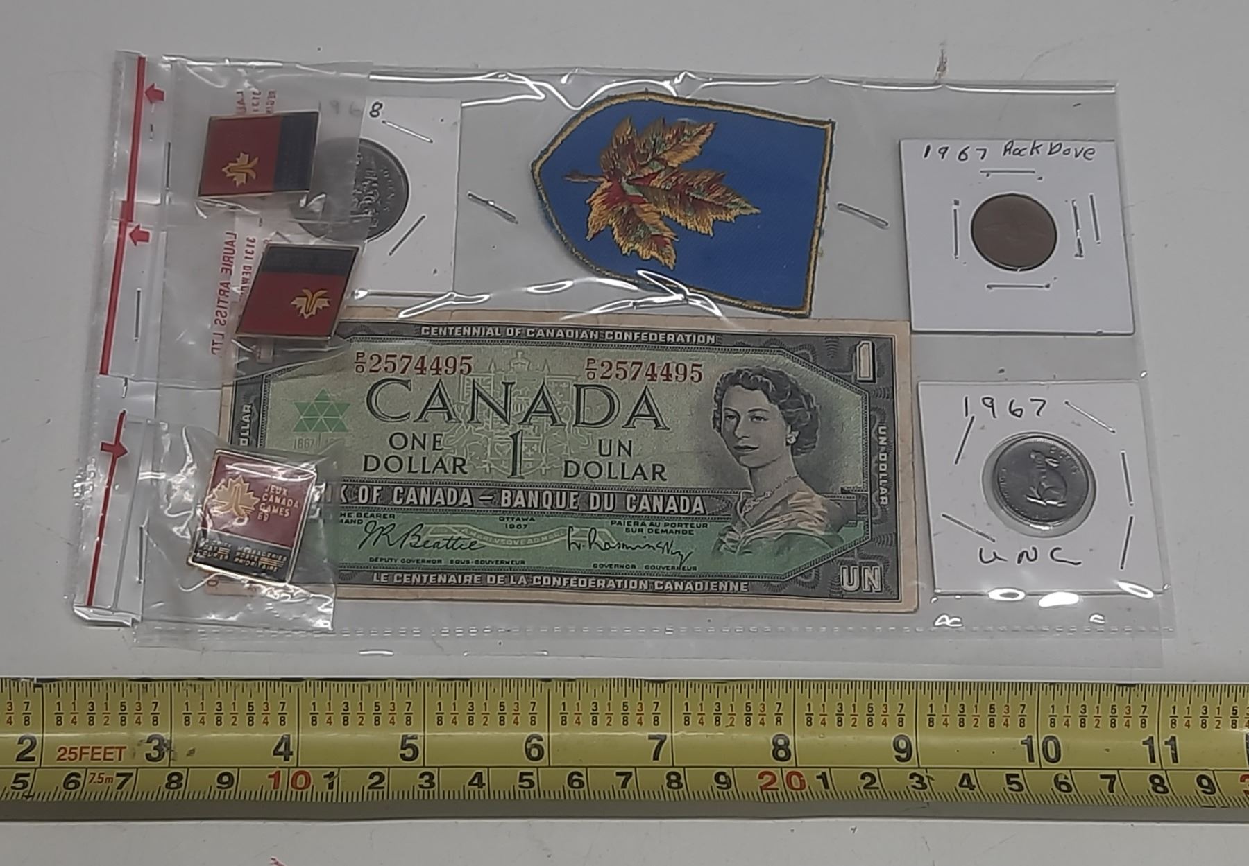 1967 Canada One Dollar, 1967 Canada 5 Cent, 1 Cent, 1968 Canada 50 Cents and (3) JEUX Canada Games 89 Pins.