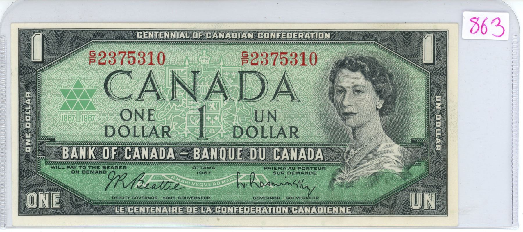 1967 Canadian 1 dollar bill - Beattie/Rasminsky - Prefix G/P 2375310