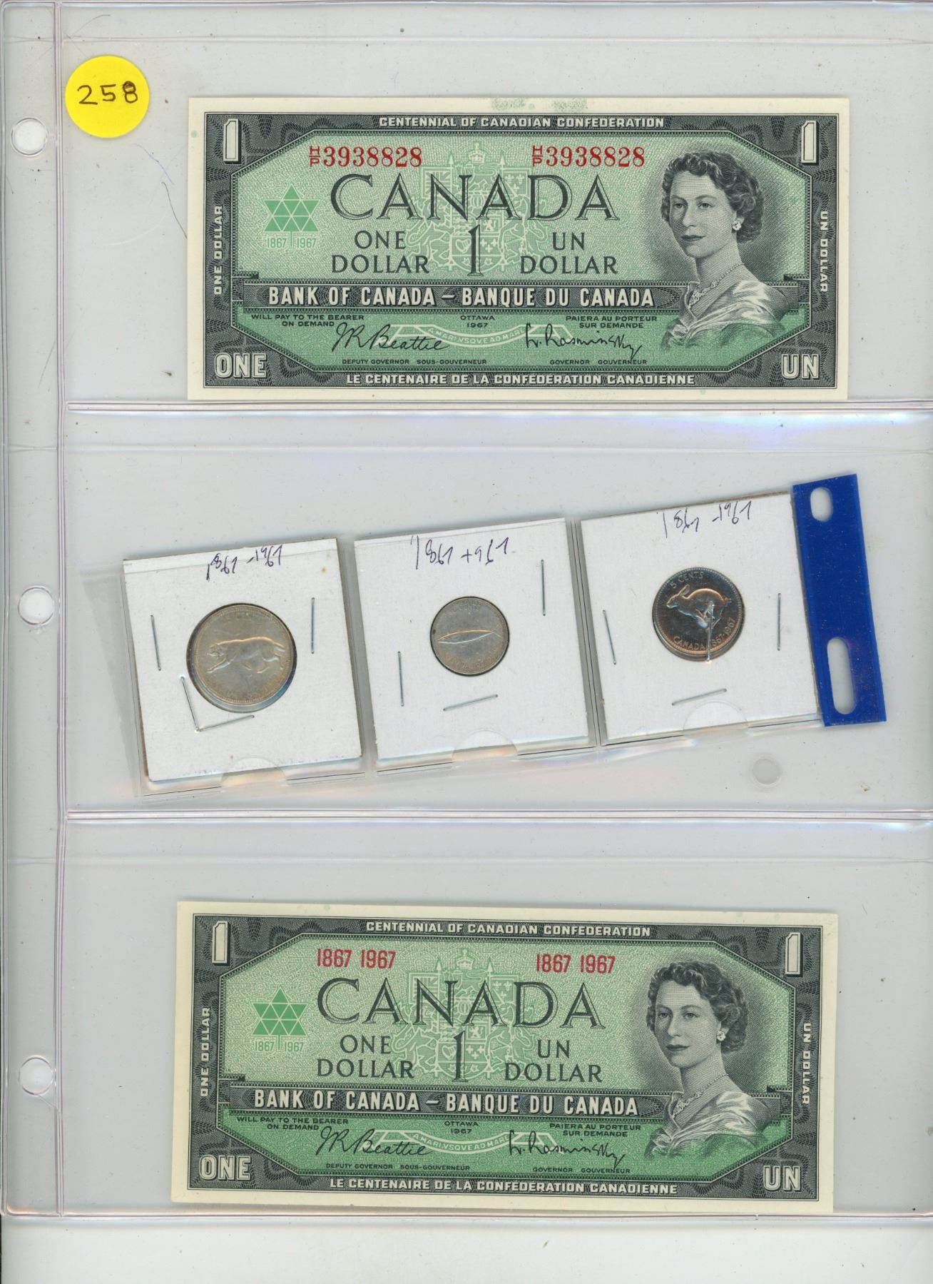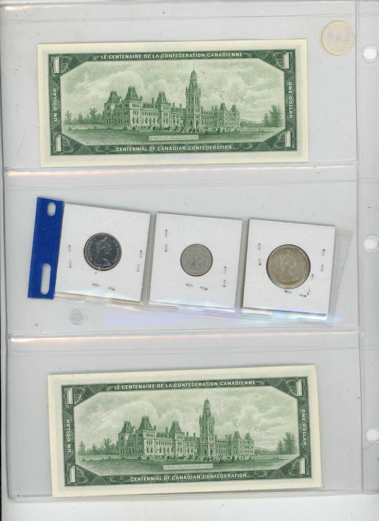 1967 Canadian 5, 10, 25 Cents and (2) One Dollar Bills..