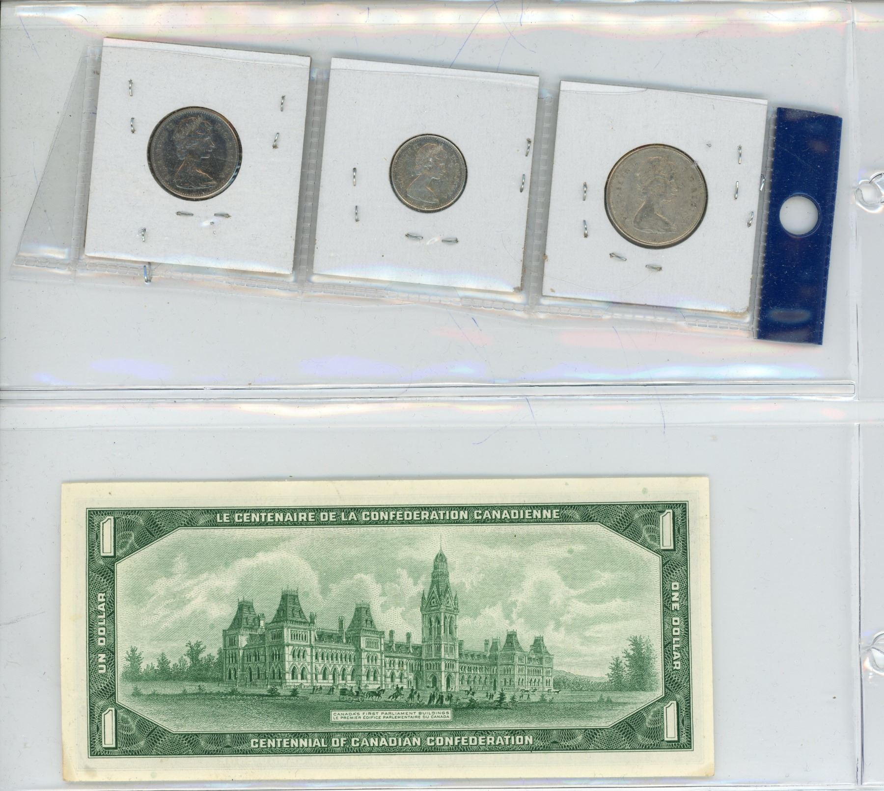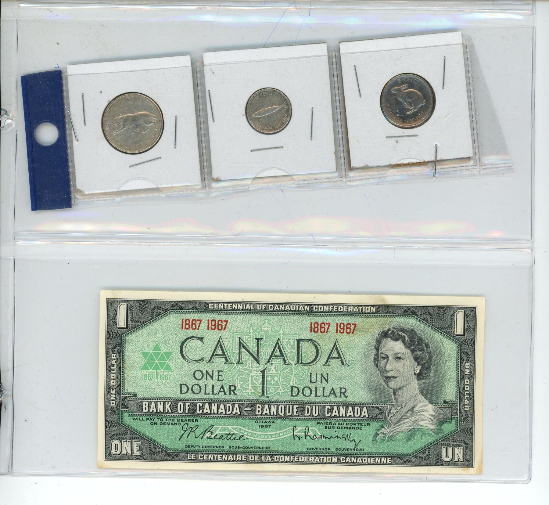 1967 Canadian Centennial Coins (Quarter, Dime, Nickel) and 1967 Canada One-Dollar Bank Note.