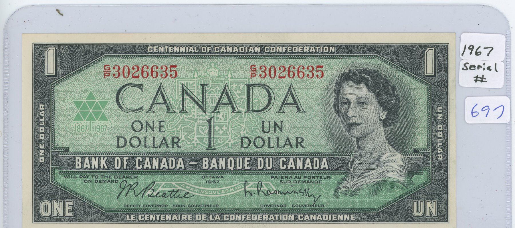 1967 Canadian One Dollar Note With Serial Number