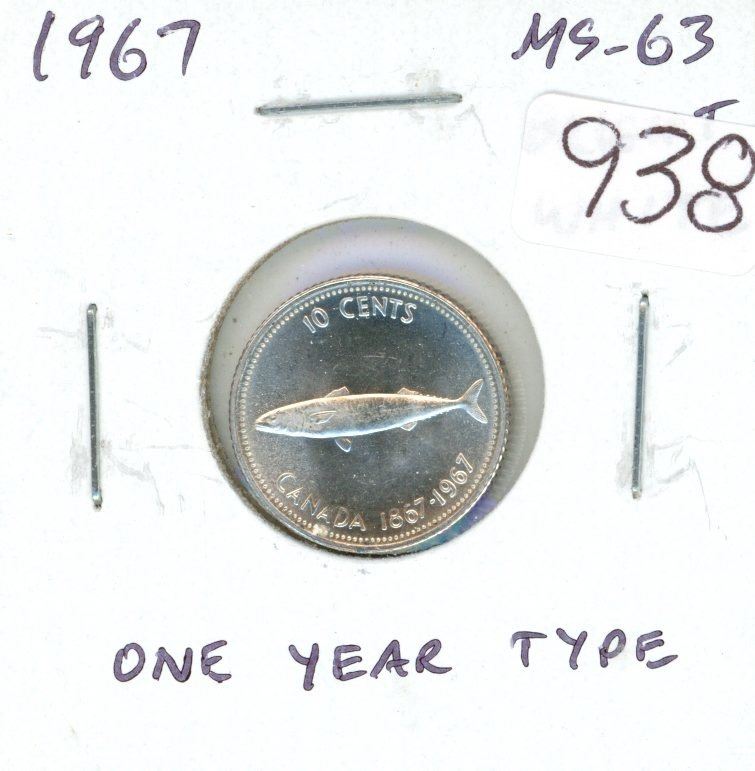1967 Canadian Silver 10 Cents. One Year Issue. MS-63. Bright White. Nice.