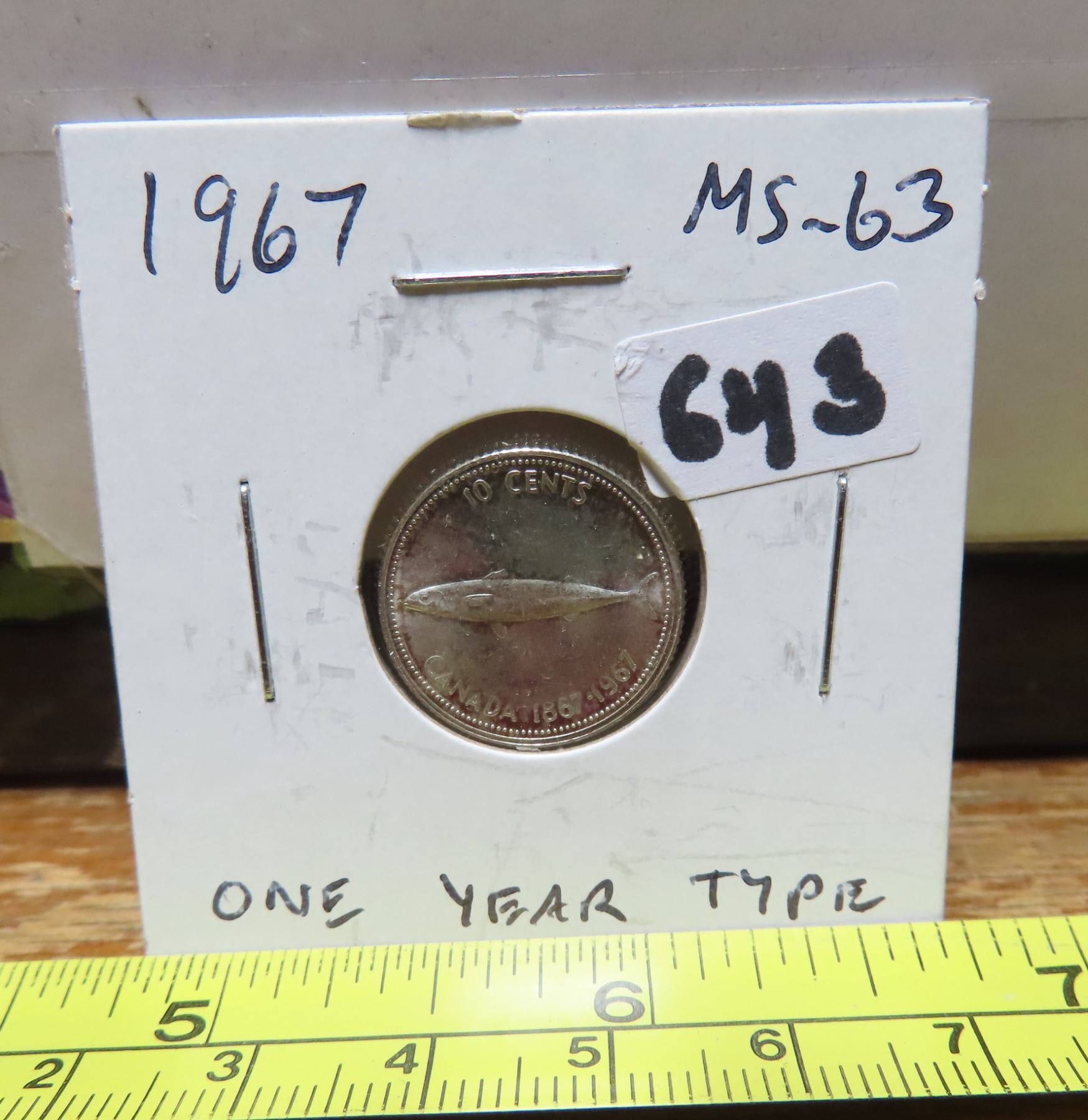 1967 Canadian Silver 10 Cents. One Year Type. MS-63. Bright White.