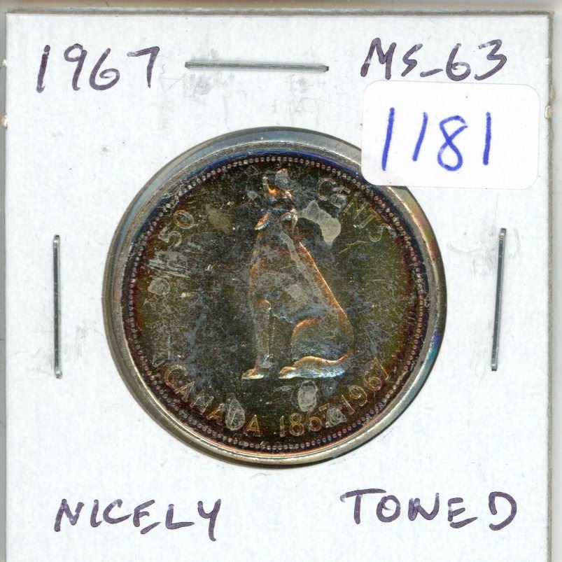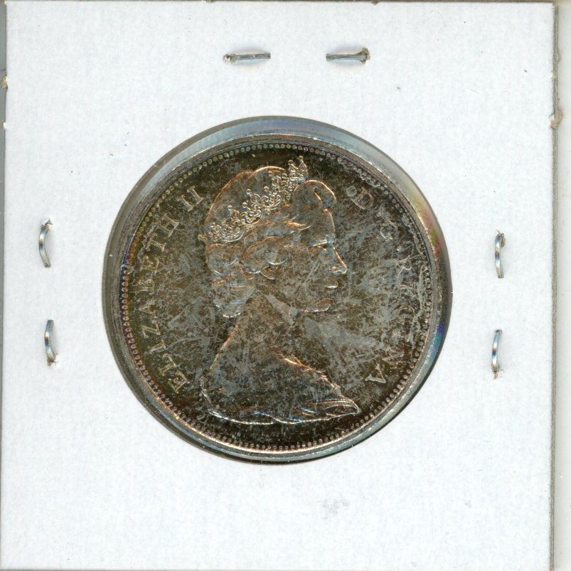 1967 Canadian Silver 50 Cents. MS-63. Nicely Toned with Rainbow Toning.