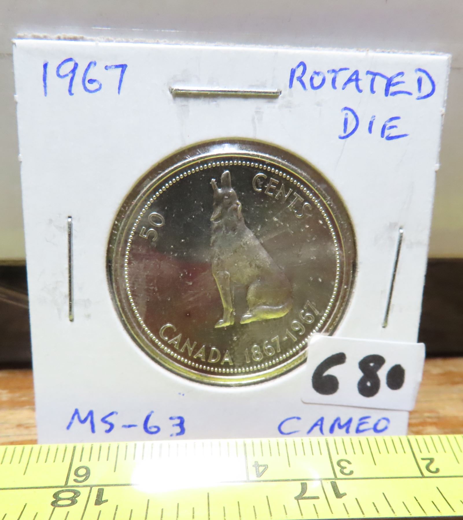 1967 Canadian Silver 50 Cents. MS-63 with Rotated Die & Cameo.