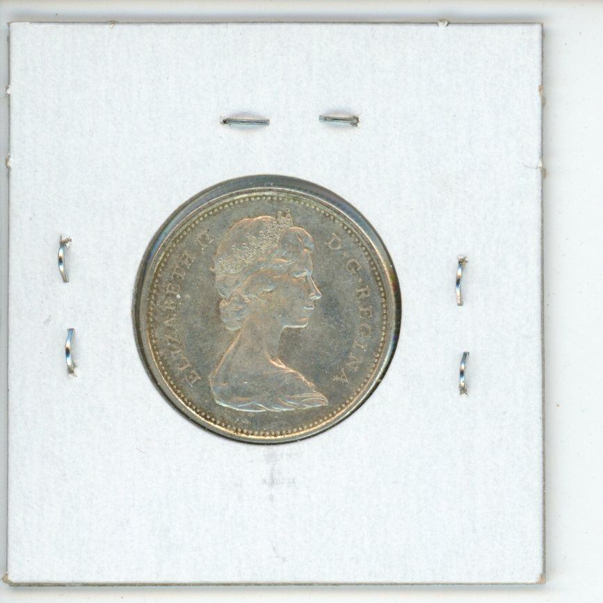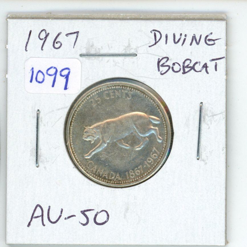 1967 Diving Bobcat Canadian Silver 25 Cents. Rotated Die. AU-50. Scarce.