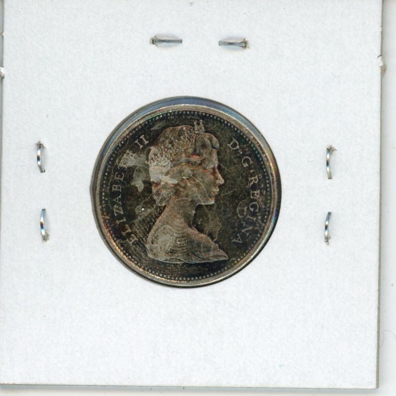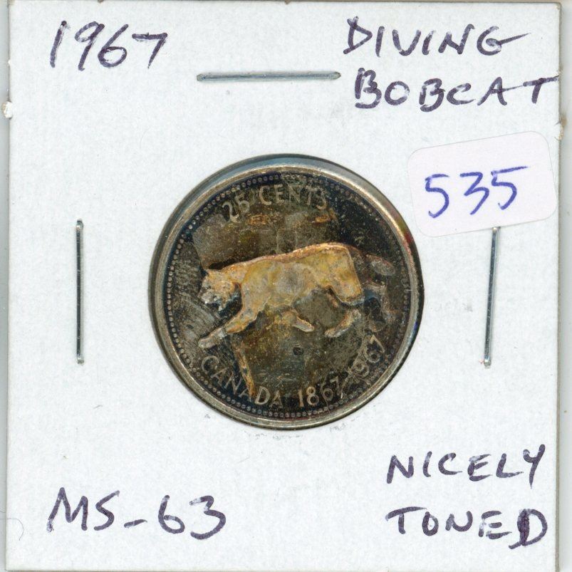 1967 Diving Bobcat Canadian Silver 25 Cents. Rotated Die. MS-63. Nicely Toned. Scarce.